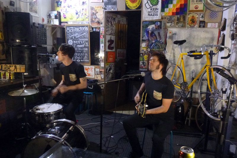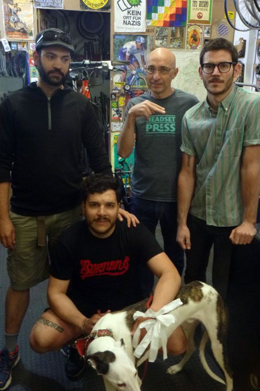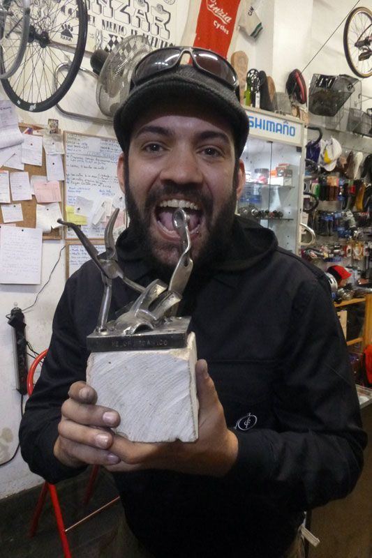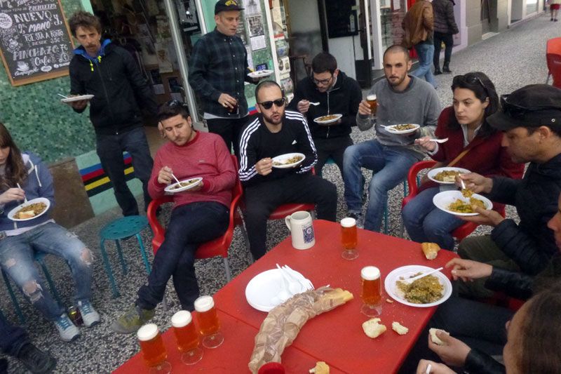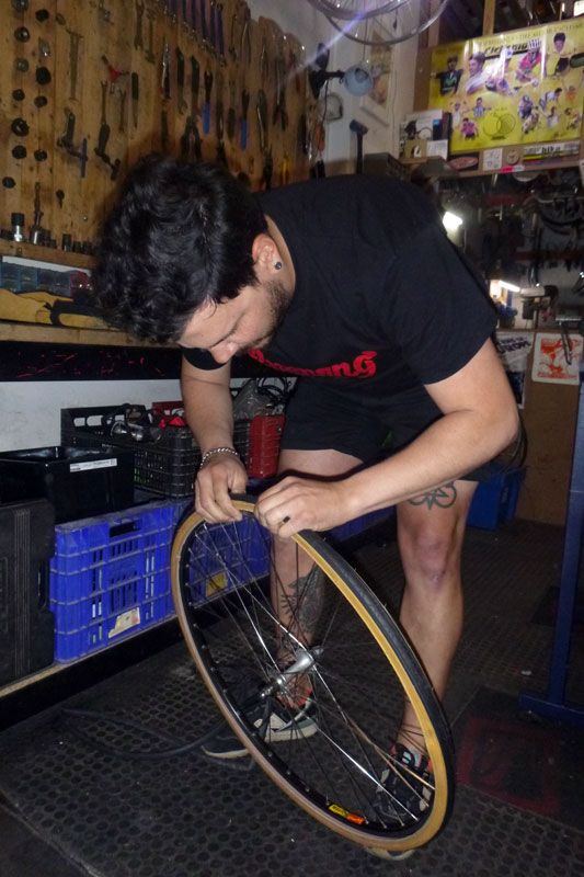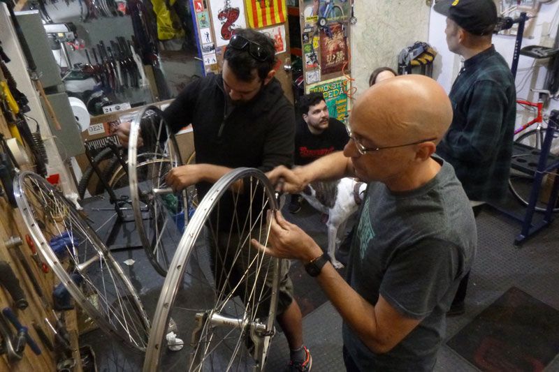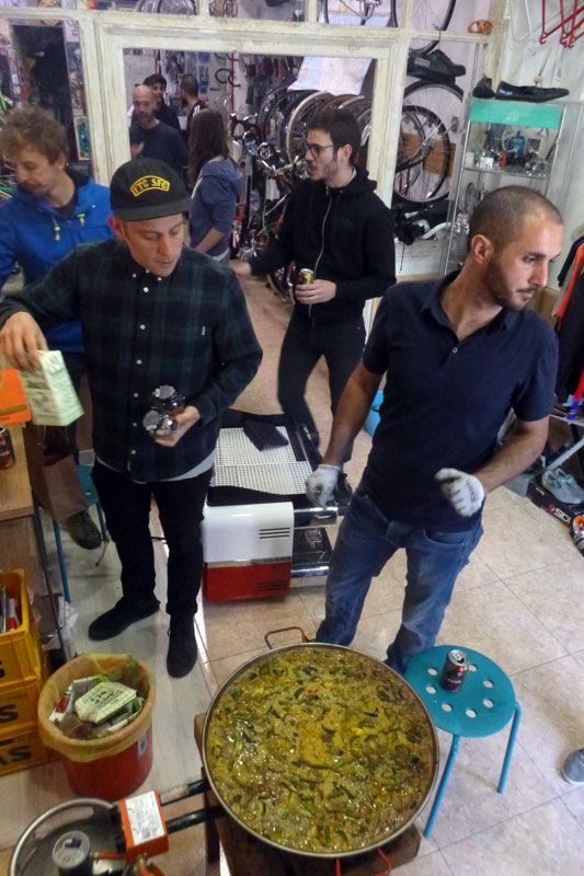 La mañana comenzó divertida tomando un cafecico con bizcocho conforme iban llegando los participantes del I Torneo de Mecánicos de Bicicletas Profesionales de Zaragoza. Es verdad que celebrarlo entre semana hace complicada la asistencia de otros compañeros que tienen que atender sus talleres ante el público, por lo que el año que viene lo organizaremos de tal manera que pueda participar más gente. Agradecer a Miguel a.k.a «Chiqui», Baringo, «Jimmy Dinamita» y Josete (compañero de la Ciclo y creador del preciado trofeo y del cartelazo del Torneo) su asistencia y lucha por conseguir la gloria del triunfo. Al final Baringo se llevó el gato al agua. Enhorabuena. El año que viene te tocará revalidar el título, ¡eh! A continuación seguimos con un vermute con el pinchadiscos más psicodélico, Jose Briceño (de los My Expanisve Awareness), que no paró de pinchar temazos mientras bajaban las cerveza, las olivas y las patatillas. La paella, cocinada a fuego lento, fue el siguiente paso dando de comer a 25 personas. A continuación nuestros colegas de cafés San Jorge nos prepararon unos cafés de especialidad insuperables que nos devolvieron a la vida. Seguimos con la charla cicloturista «Cerdeña en bicicleta» donde descubrimos una isla muy especial a la que se puede llegar en tren+barco sin mayores problemas y que ofrece un sin fin de posibilidades. Y a media tarde ya estabamos sacando los numeros para la Gran Rifa Ciclista donde repartimos 50 premios ciclistas que ya podéis pasar a recoger por el taller (gracias entre otros a Sabores Proximos, Contrahola, La Ciclería, Azafrán La cerrada, Cafés San Jorge, Los Bengala, El triángulo de las Verduras y Recycling BCN por echarnos una mano con esto). Lo que vino despues fue ya el acabose!!! Guilermo y Borja del garajero grupo zaragozano LOS BENGALA nos ofrecieron un concierto petit comité en medio del taller de alucinar. Ya veremos videos dentro de unos días. Mil gracias otra vez, ¡sois los mejores!