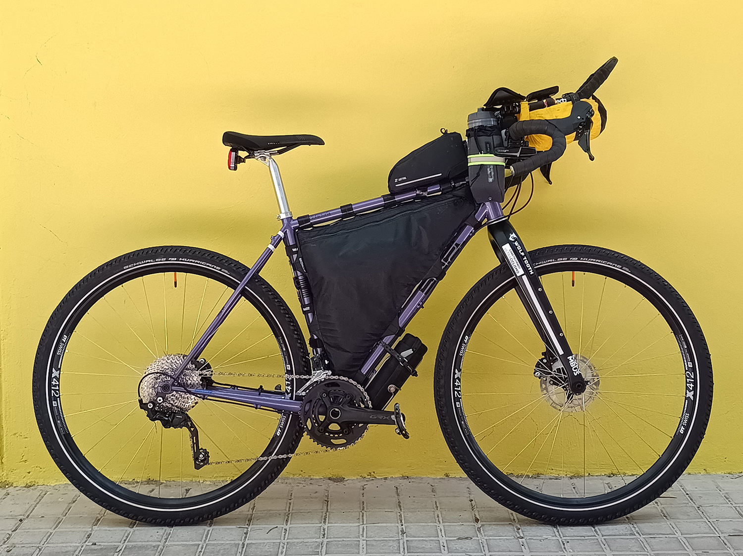 Además tuve la buena idea de montar las cubiertas Schwalbe Hurricane de 29» x 2,25 (una cubierta de btt super rodadora). Los desarrollos que monto son el grupo de 10 velocidades Shimano GRX. Delante dos platos 46-30 y detrás 11-40.