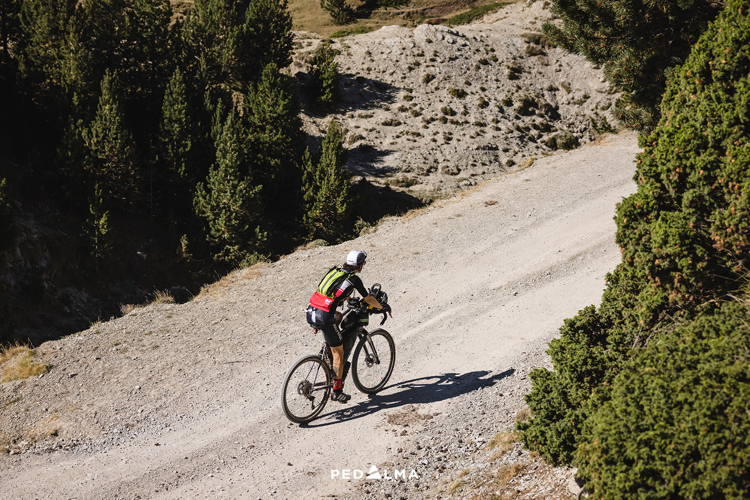 Después del CP2 se llanea por unas pistas muy buenas hasta Riu de Cerdanya, donde empieza el puerto asfaltado del Pendís. La baja por pista termina en un collado desde el que hay que adentrarse en el bosque por un camino GR que baja más de 500m de desnivel haciendo pequeñas zetas entre piedras y arboles. El típico sendero de alta montaña por el que no se puede ni empujar la bici y cuya única opción es echársela al hombro. Una vez terminada la bajada comienza una subida de otro kilómetro y pico empujando la bici hasta que llegas a una pista en la que «se puede» bajar montado más o menos despacio. En total casi seis horas de odisea para ir desde Puigcerdá a Bagá, de locos!