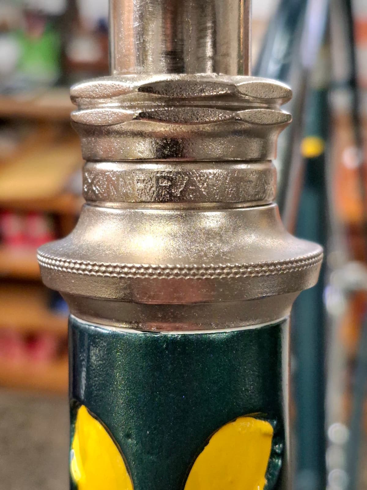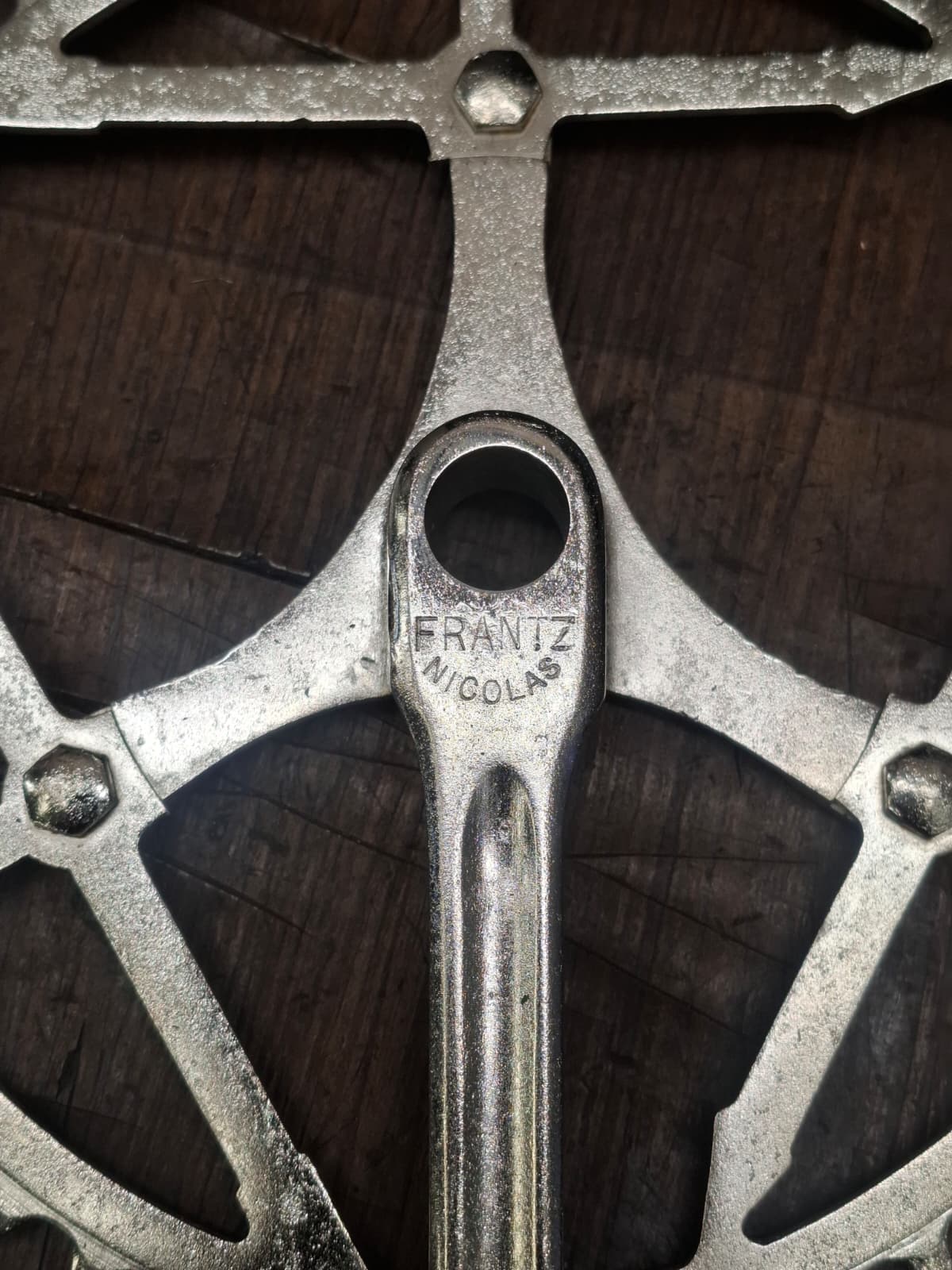 Lo que comenzó como una restauración integral se convirtió en un trabajo de arqueología. Al limpiar el acero, el nombre de la leyenda emergió en cada rincón. No era la marca de la bici, pero sí el «alma» que la hacía funcionar: el nombre de «Nicolas Frantz» estaba grabado con orgullo en el juego de dirección, en las bielas, en el eje de pedalier y en la tija. Estábamos ante una auténtica reliquia equipada íntegramente con los componentes de alta gama del taller del campeón.