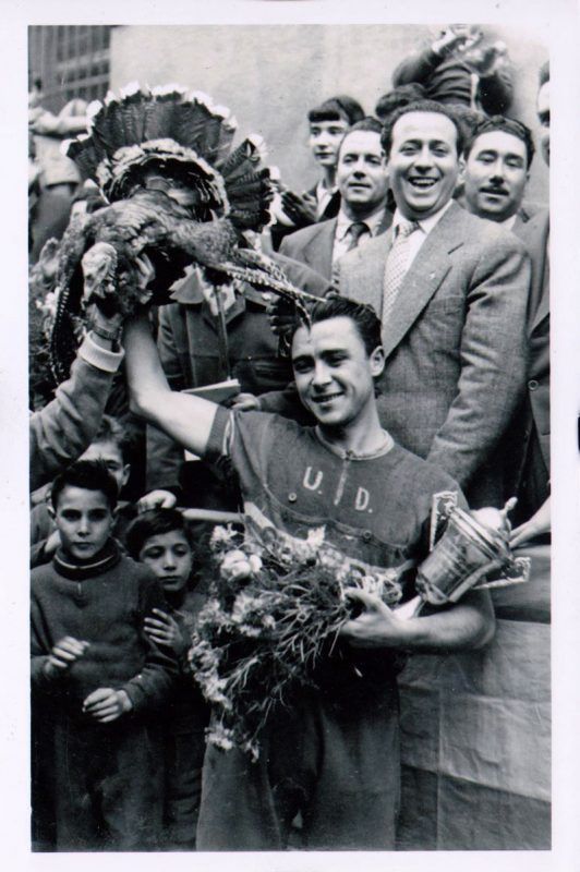 Desde el primer día que abrimos La Ciclofactoría nos han pasado muchas cosas curiosas, desde cambiarle el calzado a un caballo hasta arreglar un sillón reclinable, pero que un desconocido de más de ochenta años entre por la puerta para regalarnos una docena de botijas de los 80 y 90 fue una pasada! Y que además fuese -como luego descubrimos- uno de los ciclistas aragoneses con mayor proyección historica a sus espaldas fue la guinda del pastel. Nos quedamos boquiabiertos escuchando mil y una historias de su época como corredor. Resultó que a los pocos días volvió a tomar un café y de paso trajo una carpeta llena de textos y fotografías en blanco y negro de los gloriosos años en los que ganaba 20 pruebas por temporada y era conocido como «el Miquel Poblet aragonés». Fotografías que tuvimos el placer de reproducir y que tenemos colgadas en las paredes de La Ciclofactoría como una muestra de respeto hacia un vecino del barrio de las Delicias que no debería de pasar tan desapercibido.
