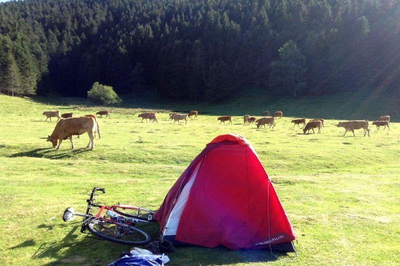 Las piernas me dicen que debería dejar ya tanto sube y baja, pues se supone que quiero llegar a Italia, pero veo el paisaje y quiero seguir aquí, entre montañas, sufriendo los puertos y disfrutando los descensos. Las noches son bien agradables y, además, ¿dónde si no podría dormir en sitios tan increíbles como este, entre vacas y caballos a orillas de un lago?
