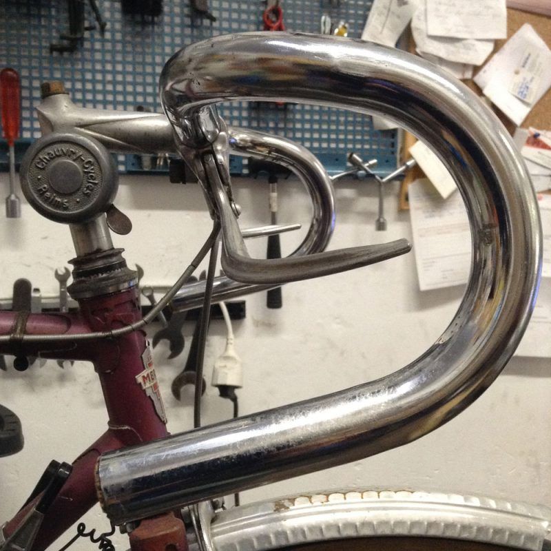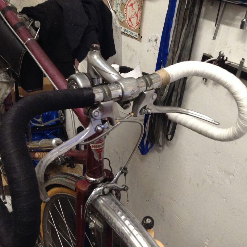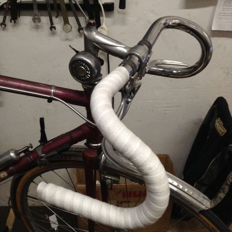 Siguiendo los consejos del colega Jordi (“Reciclone”), todo un experto en la materia, decidimos intentar encintar el manillar de una Mercier del año 62 probando la técnica que él emplea y detalla en este “post”: http://reciclone.blogspot.com.es/2011/11/manillar-vintage.html