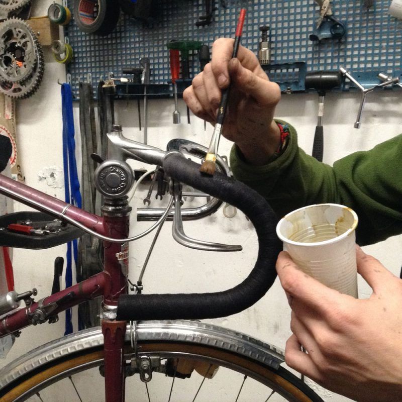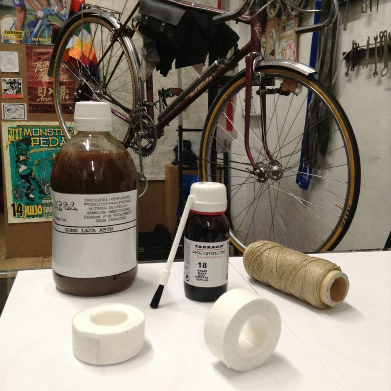 Un par de cambios hicimos con respecto a la propuesta de Reciclone: al usar tinte para cueros para conseguir el color deseado (en lugar de anilinas), no sabíamos si con el paso del tiempo acabaría por teñir las manos del ciclista debido al sudor, por lo que decidimos teñir primero la cinta de manillar y después aplicar encima la goma laca, en lugar de mezclar el tinte con la goma laca y aplicarla conjuntamente a la cinta de manillar.