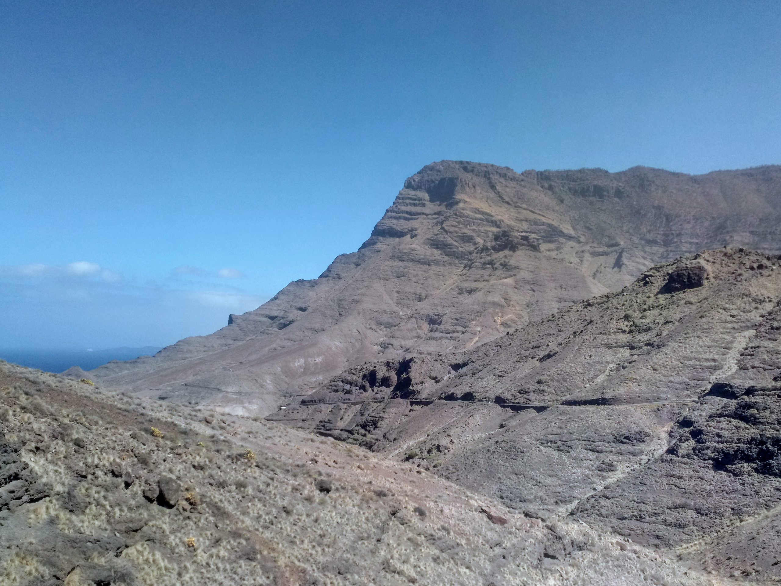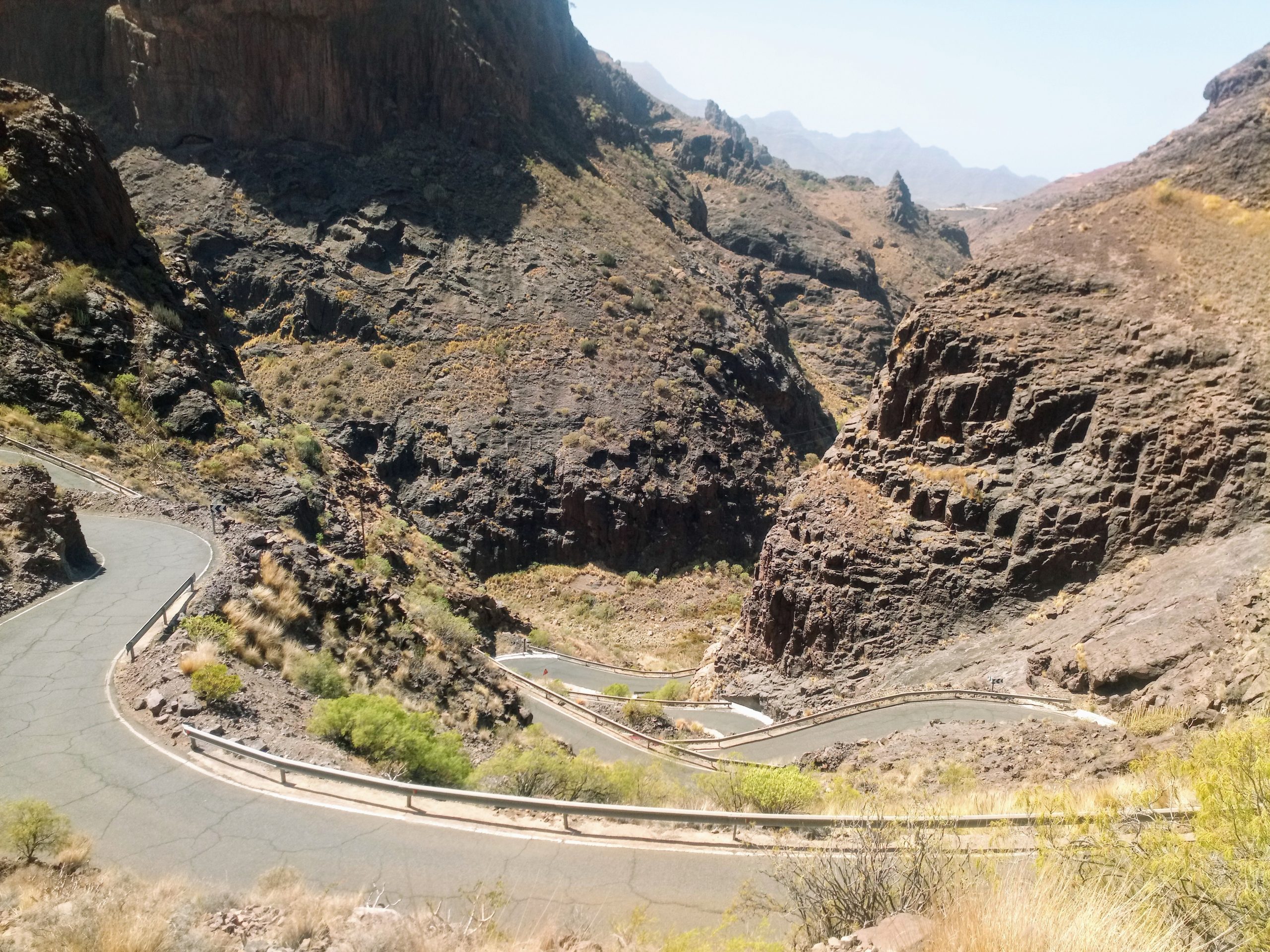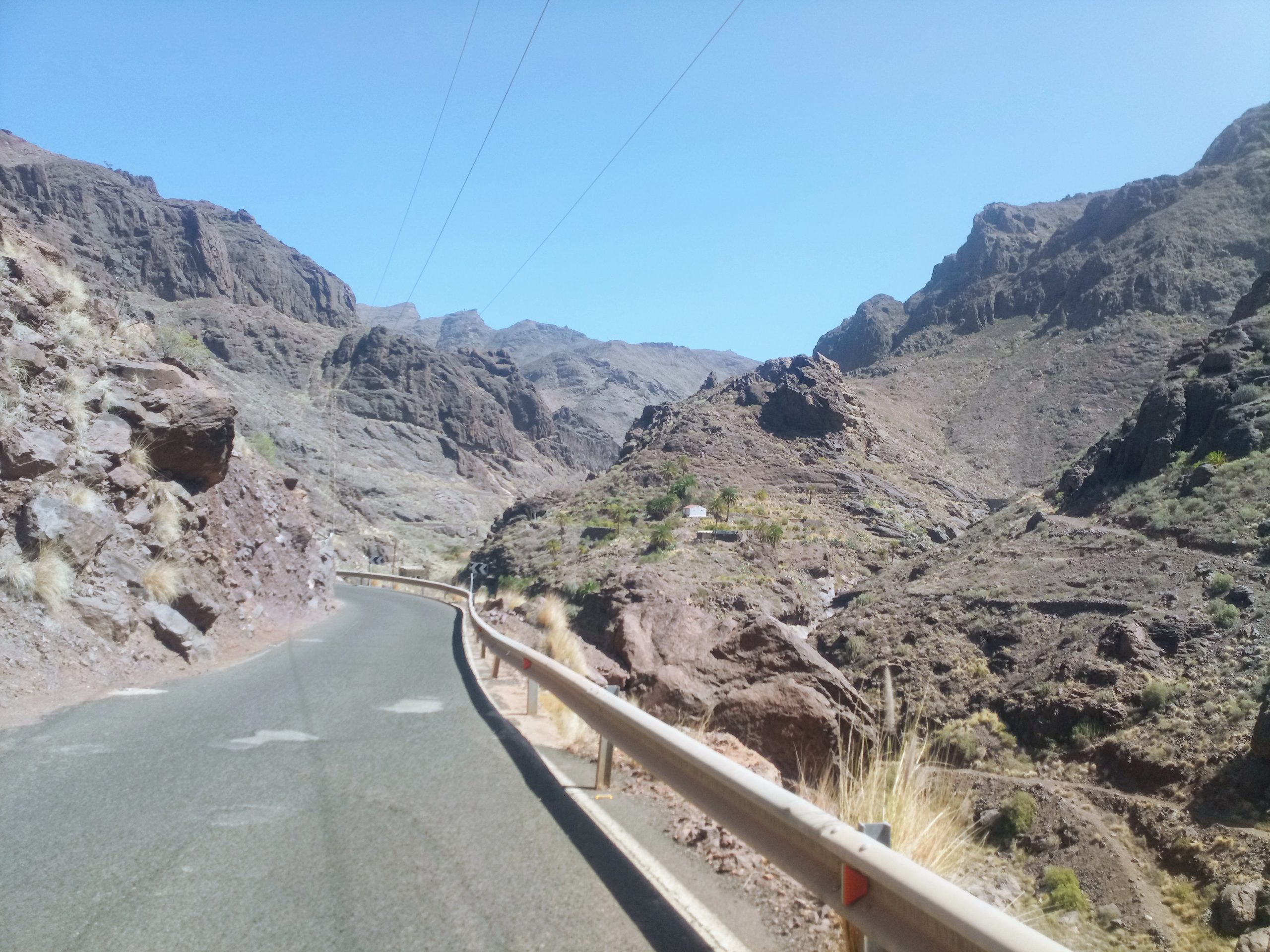 Al llegar a Artenara desde el norte (como hicimos el primer día) te encuentras de repente con el «death valley», un lugar desértico como nunca había visto (y eso que tenemos Los Monegros en casa). El valle remonta serpenteante desde La Aldea de San Nicolas al nivel del mar, hasta el propio Pico de las Nieves. Una carretera minuscula, de muy poco tráfico, conocida como la carretera de las presas por las numerosas presas super antiguas que vas encontrando conforme remontas el valle. Para salvar los desniveles de los que se aprovechan las presas para guardar el agua, la carretera dibuja unas divertidas zetas al estilo de Alpe d’Huez en miniatura, pero seguidas unas por otras, lo que la convierte en una ruta muy explosiva cada pocos kilómetros.
