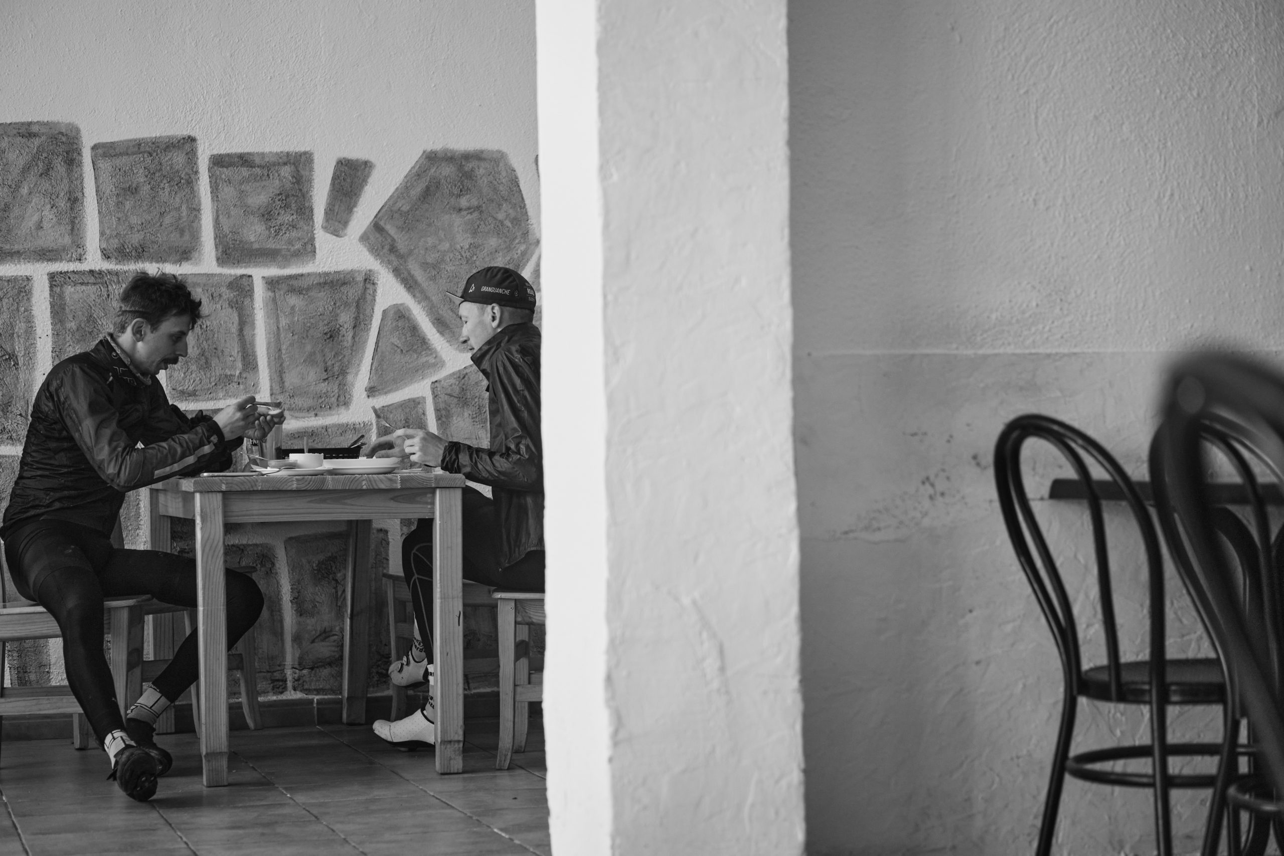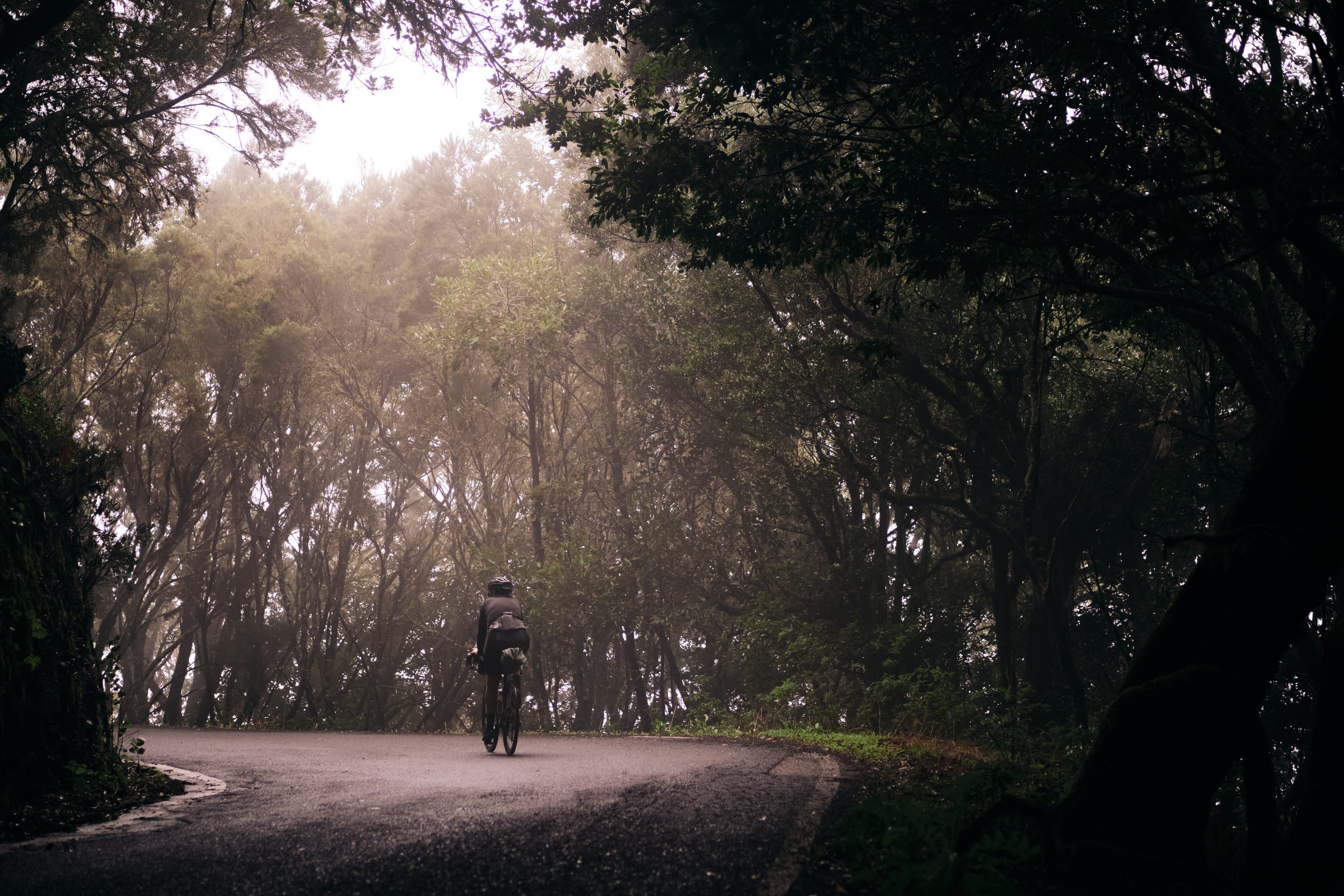 Cruzamos a La Gomera Ana, Till, Annika, Jorge y yo en el mismo barco. Desembarcamos y me encuentro a Justinas que terminó ayer en tercer lugar y tiene ganas de seguir pedaleando, así que se apunta conmigo a dar la vuelta a la isla otra vez. Todos empiezan rápido a pedalear pero yo ya no estoy en modo carrera. He conseguido llegar aquí hoy, en mi cumple, cuando todo apuntaba a que tendría que alargarlo un día más y voy a disfrutar de la última isla. La Gomera es increíble, parece que todos los puertos aquí tienen 20km y son duros. Arriba, en el centro de la isla, hay un bosque de laurisilva y una niebla permanente que le da un toque mágico. No parece posible que haya llegado allí en bicicleta, parece que estoy mucho más lejos, en alguna isla remota de Asia. La mente sabe que ya solo quedan 100km hasta meta y se relaja y empiezan los dolores: culo, rodilla, cervicales… Pero acompañado de Justinas y de Matt, el organizador, haciendo fotos, se hace mucho más llevadero. Paramos a comer de plato y tenedor en Arure, ¡que por algo estoy de cumpleaños! Descubrimos el potaje de berros, el almogrote y el barraquillo con licor, preludio de lo que van a ser los próximos 5 días de vacaciones con Justinas en la isla: seguir descubriéndola a pedales adentrándonos en sus pequeñas poblaciones en busca de bares auténticos donde el tiempo parece haberse detenido.