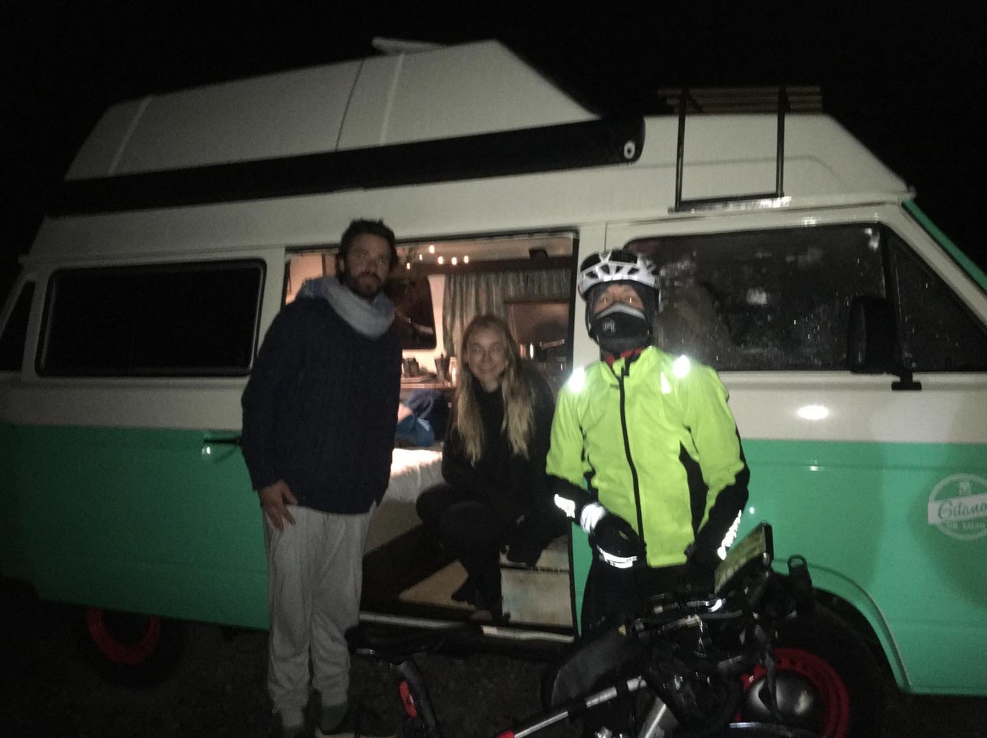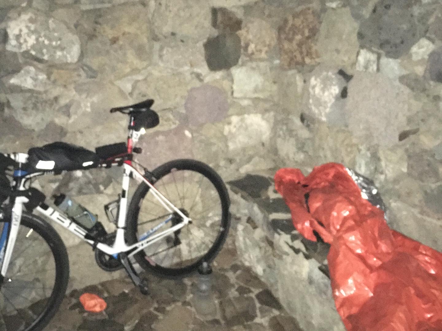 Cuando llego a La Esperanza paro a comprarme un bocata y ya que tenía pagada la habitación en una pensión, me subo a comérmelo a la cama… es lo más snob que he hecho en mi vida: pagar alojamiento para comerme un bocata tumbado. De pronto empieza a llover afuera y me entran dudas, pero miro la meteo y en teoría no dan lluvias arriba. Sin embargo, para mañana auguran nieve, por tanto hay riesgo de que corten la subida al Teide y se acabe la carrera definitivamente para mí. No le doy más vueltas y salgo del hotel. Son las 20.30h y me queda una subida de 30km. No llueve pero la niebla es densa, la cual voy cortando a mi paso. Del Teide solo veo las líneas blancas del arcén y las balizas de nieve. La luz de mi frontal se refleja en la niebla y no consigo ver a más de 50cm de mi rueda. Sé que no estoy haciendo lo correcto. Voy muy bien de fuerzas y de sueño, pero me estoy metiendo en la boca del lobo: se sube hasta cota 2.300 y no sé si esta niebla arriba será ya nieve, agua o qué… Cuando llevo ya mitad de ascensión completada asumo que no hay vuelta atrás y dejo de darle vueltas. Voy empapado hasta arriba de tanta niebla que he comido y cuando llego al Parque Nacional del Teide me encuentro a Ana Orenz que había cometido la misma imprudencia que yo y quería hacerlo de noche también. Son las 23h y hacen 0,5ºC y una pareja en una furgoneta le dan cobijo, pues está a punto de la hipotermia. Me ven, me llaman y me cobijan a mi también. Son un chico de Lanzarote y una chica de Noruega, que alucinan con el tipo de carrera que estamos haciendo y nos dan todo el calor que pueden. Tratamos de secar nuestras ropas, nos dejan abrigo y nos hacen un té. Una hora entrando en calor y decidimos salir. Como por arte de magia la niebla densa ha desaparecido durante este rato y ahora el cielo está despejado, condiciones perfectas para celebrar mi cumpleaños, que comienza justo en ese instante.