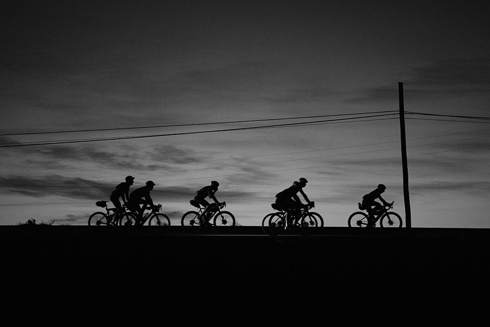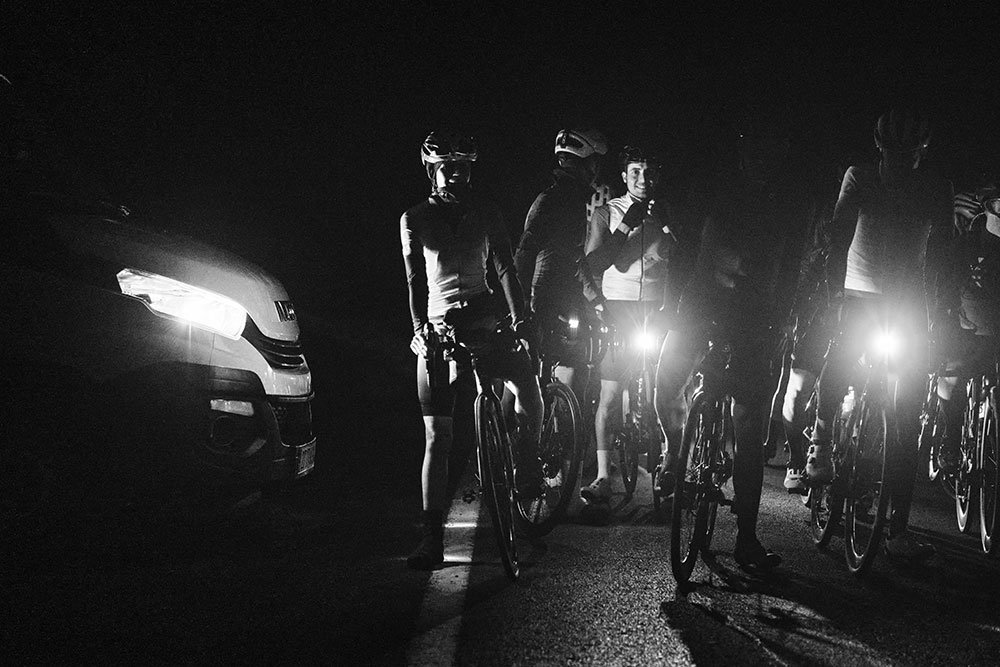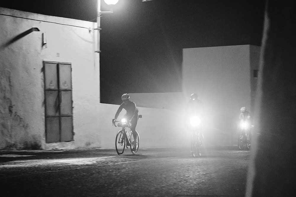 Son las 5 de la mañana en Órzola, norte de Lanzarote, y 50 participantes nos juntamos para comenzar la aventura. Las únicas luces que se ven en todo el pueblo son las de nuestras bicicletas, pues por alguna razón a las 4 de la mañana todo el municipio ha sufrido un apagón eléctrico y se encuentra a oscuras. No hay farolas, no hay nada. Solo estrellas en el cielo y nuestros frontales, que echando la vista atrás conforme empieza la primera subida del día, parecen estrellas a ras de suelo. La carrera empieza con un puerto largo y duro desde el primer kilómetro y no tardan en empezar las hostilidades. Yo pensaba que rodaríamos en grupo tranquilamente aunque fueran las primeras dos horas, pero está claro que la gente tiene ganas de exprimirse e incluso de mejorar los tiempos que están marcados como ritmo «audax», es decir, lo que la organización había previsto como ritmo y combinaciones de ferris más rápidos posible.