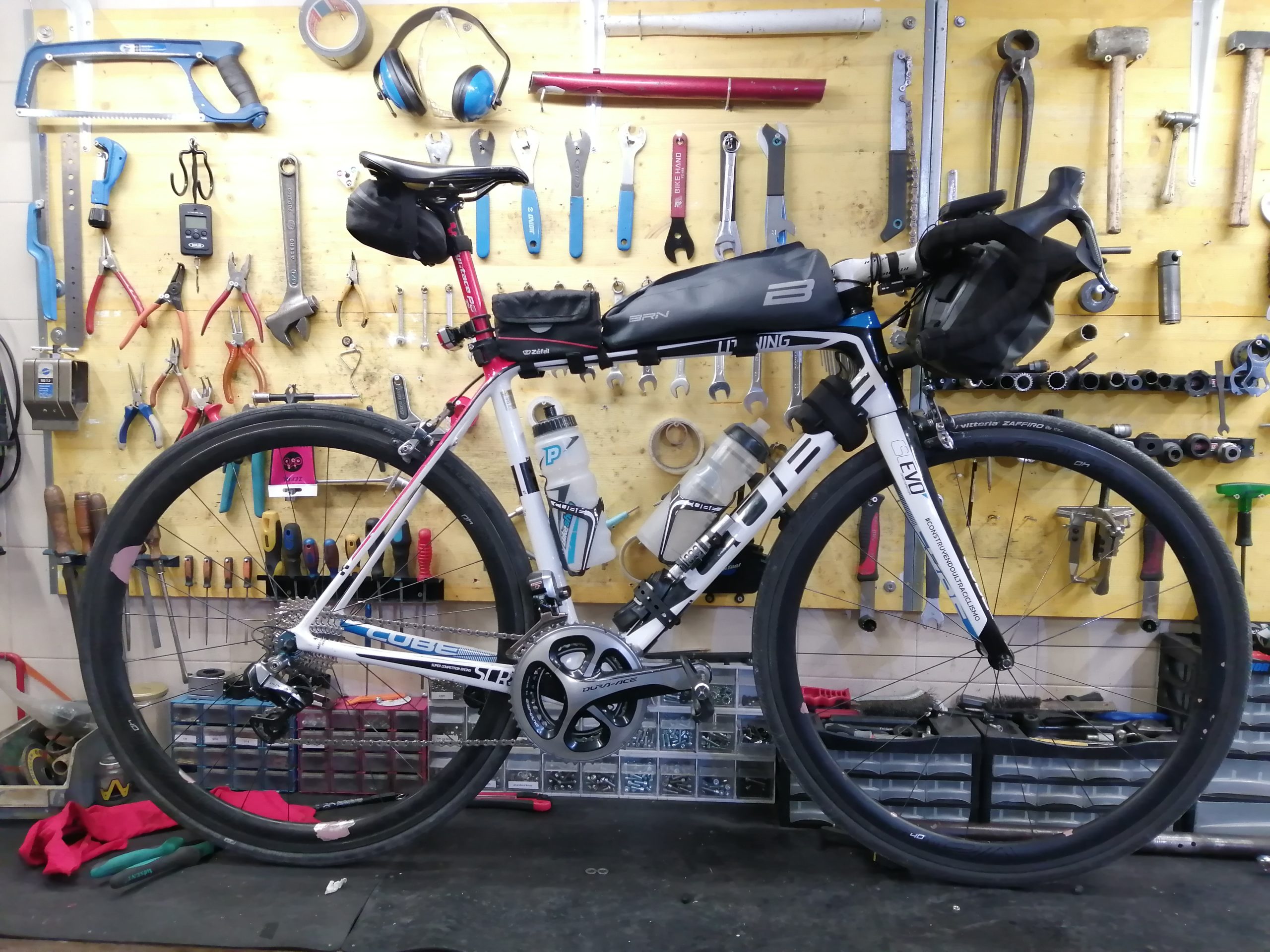 La bici que llevé es la que uso para cualquier tipo de salida en carretera, pues es la única que tengo. Una Cube Elite de 2013 que la he ido mejorando poco a poco y para esta carrera estrenaba el grupo electrónico di2, el cual ofrece un confort que solo descubres y te imaginas una vez lo pruebas. Tiene frenos de zapata y un paso de rueda máximo de 25mm. En cuanto a desarrollo, un compac 50-34 delante y un 11-30 detrás. ¿Suficiente? ¡Si hubiera llevado un piñón de 40 dientes lo hubiera usado bien a gusto también! Es una bici muy ligera, que con todo el setup (sin contar la mochila a la espalda) me pesó para esta prueba 10,800gr (sin agua ni comida).