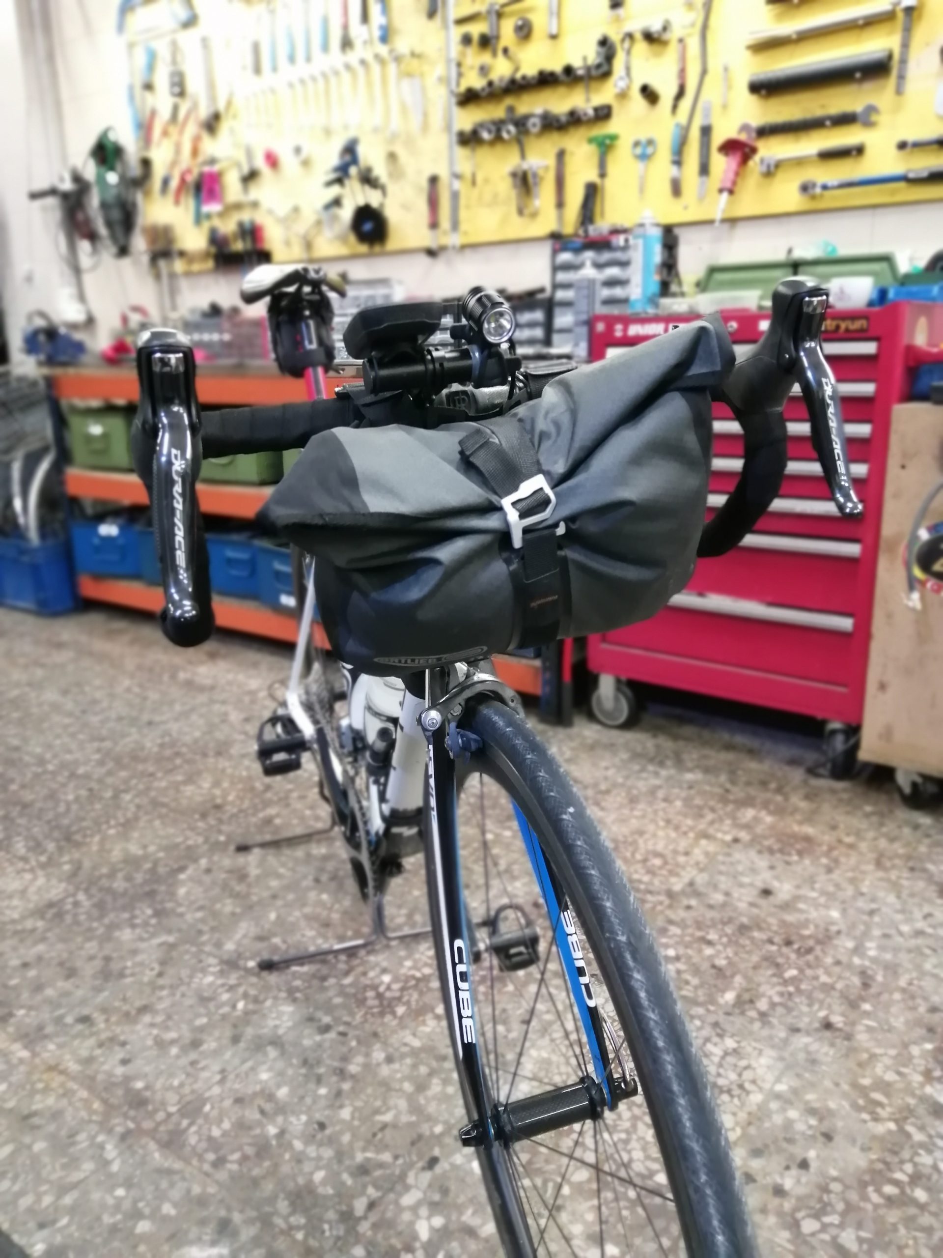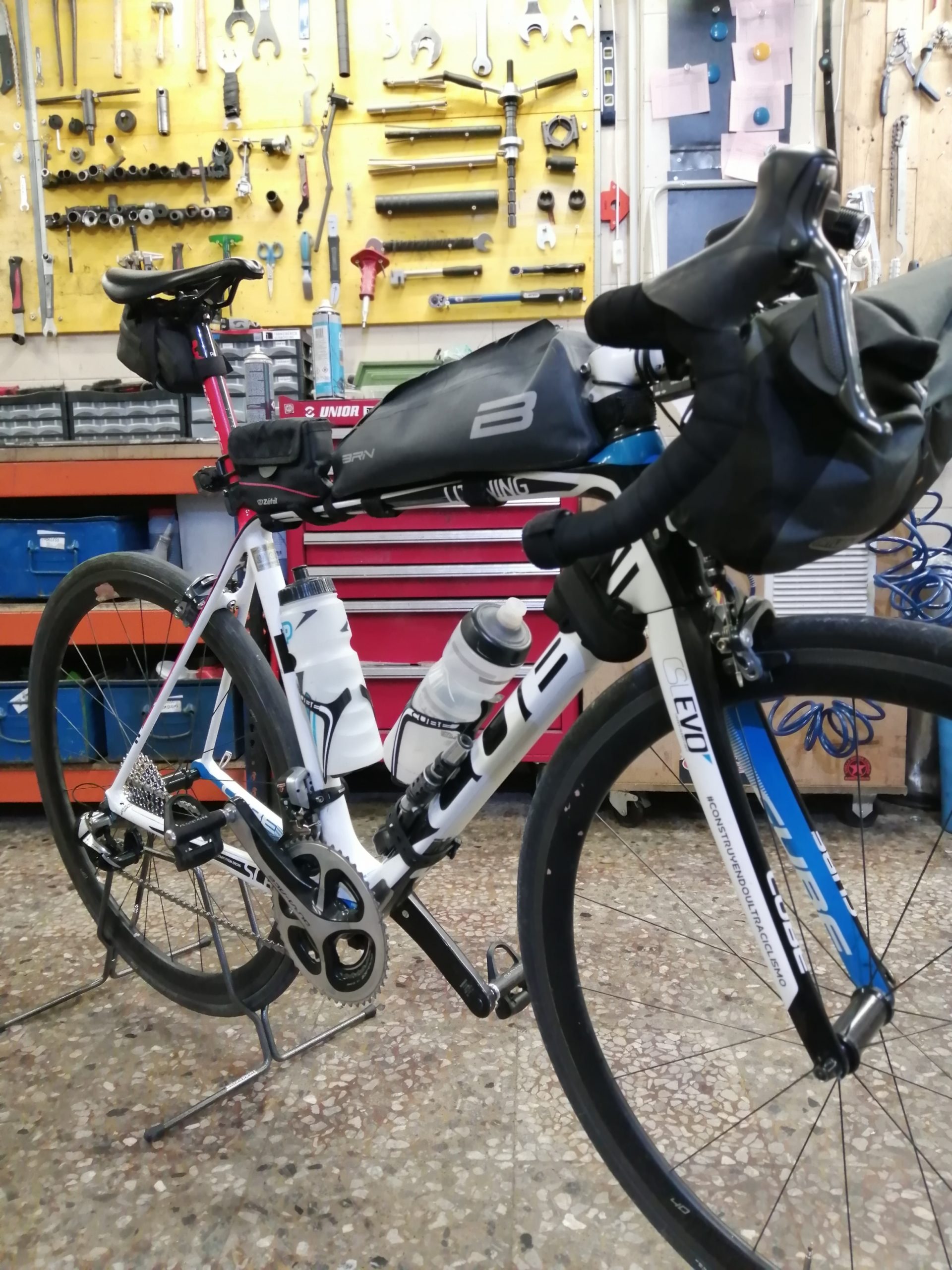 Opté por una bolsa de manillar Ortlieb de 4l donde me cabe la chaqueta Etxeondo para el frío, los guantes, gorro, buff, perneras y calcetines gordos. También llevé una bolsa en el tubo superior del cuadro marca BRN donde llevaba los cargadores, móvil, monedero y la comida para ir comiendo en ruta y otra pequeñita de Zefal, para más gominolas y demás. En el sillín llevaba una bolsa de herramientas con lo básico: cámara, 2 botellas co2, desmontables, parches, multiherramienta, lubricante para la cadena y un trocito de cámara por si se me raja el neumático. Además llevaba otra cámara de repuesto amarrada al cuadro. En cuanto al agua, opté por dos bidones de 750ml. Por último, llevaba puesto un chaleco-mochila de trail en la espalda de 5l de capacidad, donde llevaba más comida por si acaso, una camiseta térmica, el chaleco reflectante y me fue muy útil también para meter dentro todo lo que quería llevar conmigo en butaca durante los viajes en ferry.