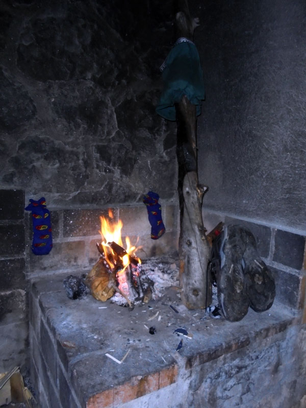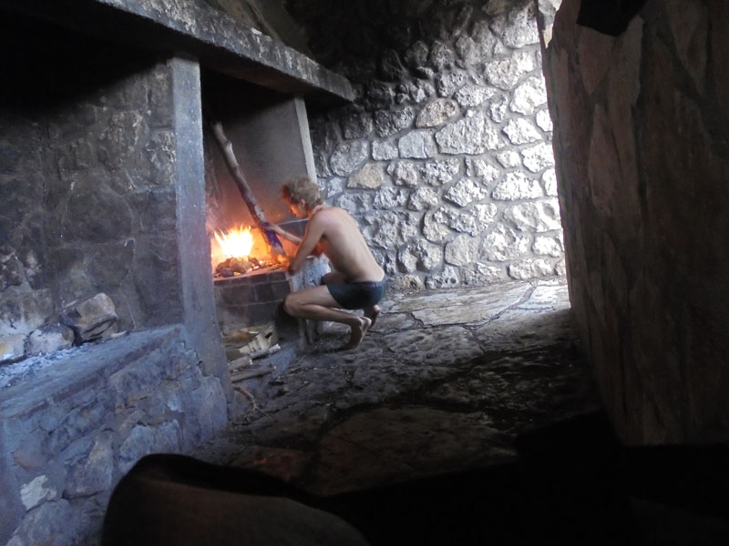 A Cuenca entro a 60 km por hora bajando a toda velocidad. El día ha aguantado hasta ahora, pero se avecina tormenta de verano. Por aquí, tanto el paisaje como las carreteras se parecen bastante a las de Teruel: practicamente estoy yo solo en el camino. Son las 16h de la tarde y el cielo se cierra con nubes grises que anuncian pedrisco. Empiezan las primeras gotas y en menos de un minuto se ha puesto a granizar de lo lindo. Al principio intento hacer como que no pasa nada, pero enseguida el dolor de las bolas de hielo en mi espalda y nudillos de las manos me hace parar. Menos mal que llevo casco. Estoy paralizado del frio y del dolor. Y del miedo, porque no hay ni un solo sitio a mi alrededor donde pueda cobijarme. Derrepente pasa un coche, el primero con el que me cruzo en mucho tiempo, y se apiada de mí. Para a mi lado y me dice que me suba. ¡Qué maja es la gente en Cuenca! Después de 5 minutos parados en el arcén, cesa el temporal y aunque sigue lloviendo, ya se puede pedalear. Les doy las gracias, me bajo, cojo la bici y continúo. A menos de un kilómetro, en el desvío a Beamud encuentro una zona de picnic con techo y chimenea para hacer barbacoa. Recojo unos papeles y algo de madera seca y me hago un fuego. Casi no lo logro porque se me olvidó llevarme un mechero, pero por suerte en el botiquín me han aparecido 4 cerillas. Las dos primeras se me han apagado nada más encenderlas pero con la tercera lo he conseguido. Hay muy pocas cosas que den tanta satisfacción como encender un fuego con pocos recursos, y más si estás mojado hasta el tuétano. Debería ser asignatura obligada en el colegio. Me desnudo y pongo toda mi ropa al lado del fuego para tratar se secarla de alguna forma. Estoy tan contento que me hago una foto para no olvidar este fuego que me ha dado la vida. Logro secar bastante bien la camiseta, culotte, calzones y zapatillas, a costa de oler ahora a salmón ahumado.