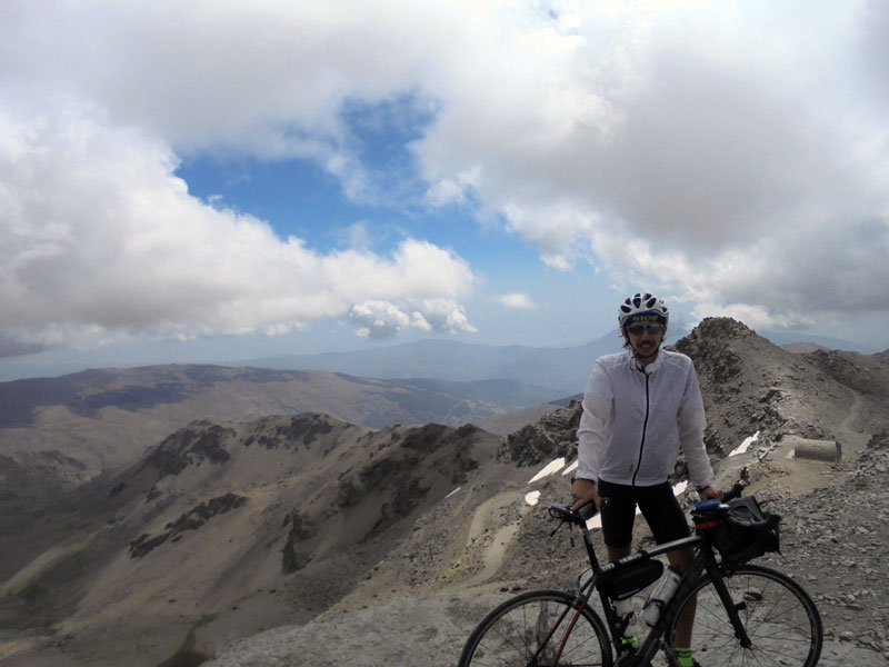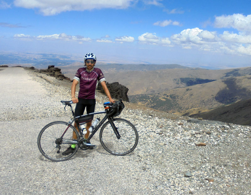 Salgo de Jódar y la carretera continúa cuesta arriba como antes. El frescor del anochecer se agradece, el paisaje acompaña y de pronto me teletransporto. Las subidas no duelen, siento que una fuerza invisible me empuja. Me adentro en la noche cerrada cuando llego a la provincia de Granada, dirección a Nívar. La autovía, que parece la forma más fácil de llegar, no está desdoblada, así que he buscado una ruta que pasa por Iznalloz y Deifontes, para bordear las faldas de la sierra de Huétor y descender después hasta Nívar. Cuando miré la ruta en el mapa no presté demasiada atención al desnivel y, aunque sé que me toca subir un poco, no soy consciente realmente de lo que me espera. Son las 12h de la noche y me doy cuenta de que voy a conseguir llegar hasta Granada en tres días, y en lugar de tomarme con calma la última parte de la etapa, atravieso Deifontes como si estuviera corriendo en un criterium. Dejo atrás el pueblo y sus cuestas del 25% a toda velocidad dirección al monte. Me he dejado casi todas las fuerzas que tengo pensando que después de cruzar el pueblo llegaba ya la bajada hasta Nívar, pero me he equivocado. Ahora empieza el monte, son caminos sin asfaltar y no para de subir y subir. Paso por unas trincheras de la guerra, un santuario, miles de olivos… Solo veo los 50m que alumbra mi linterna y no sé cuándo va a dejar de subir este maldito camino. Al límite de mis fuerzas ya, exhausto como nunca antes me dejo caer y me tumbo largo en el camino. Por lo menos hay mil estrellas y me quedo un rato mirándolas sin poder parar de jadear. Me levanto y empujo la bici como puedo hasta que empieza el descenso por la otra vertiente. He tardado dos horas en hacer 20 km y sin una gota de fuerza más llego a mi destino a las 2 h de la mañana. Estoy sin aliento pero realmente emocionado; parecía que no llegaba. Abro el mapa y marco en él la ruta de hoy (250 km y un desnivel positivo de 3.100 m) uniéndola con las de los dos últimos días. Una línea casi vertical atraviesa siete provincias y 4 comunidades autónomas para cruzar un cachito de la pensínsula en tres días. Hoy sí, toca descansar en una cama para mañana subir el Veleta, que le tengo ganas.