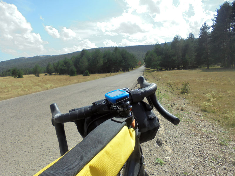 Comienzo a pedalear a las 11 de la mañana, con un par de bolsas de Cordel como equipaje y, por primera vez, un GPS que estreno en este viaje. Llevo bastante tiempo sin rodar en serio y lo noto nada más empezar. La provincia de Teruel es preciosa e igualmente dura. Llego a Orihuela del Tremedal y comienzan los Montes Universales. Carreteras desiertas al cobijo de bosques húmedos, con ciervos que cruzan al paso o galopan a mi lado. Huele a madera, a hierba, a rebaños de ovejas sueltos. Voy subiendo y subiendo y maldigo haber parado a comer un guiso de ciervo en Griegos. ¡Qué rico estaba pero cómo pesa ahora!