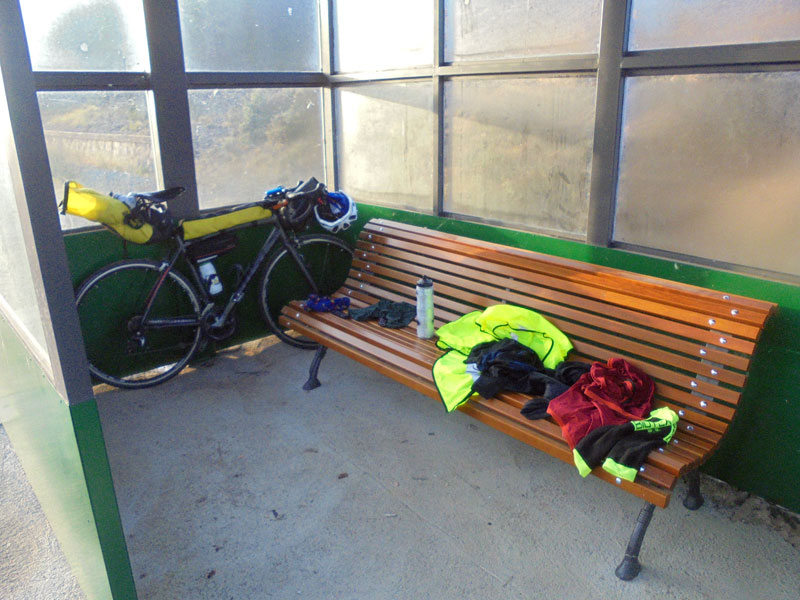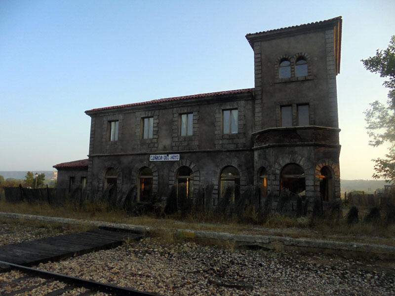 Empieza a atardecer y reanudo la marcha. Las carreteras, tan secundarias que hasta ese término se les queda grande, son un constante sube y baja y empiezo a estar cansado. En Valdemoro se me ocurre preguntar a los parroquianos del bar si la ruta que aparece en mi mapa es efectivamente la mejor para llegar al destino que tengo marcado. Después de 10 minutos de discusión entre ellos, me convencen de que tome otra ruta, pues la que me aperece en el mapa como la más lógica es un rodeo tremendo, según ellos. Error, gran error. Lo tengo más que aprendido, pero de vez en cuando vuelvo a caer en la misma trampa: nunca preguntes a un paisano si en el mapa ves algo claro. Al final sigo la ruta que ellos me indican y me desvío bastante de mi destino. Son las 21.30h, ya ha anochecido, estoy muerto y solo llevo 170 km. Me quedan 40 km más para cumplir el objetivo del primer día, pero ya no quiero más. En la antigua estación de Renfe abandonada en Cañada del Hoyo encuentro un banco para dormir y esperar a que amanezca.