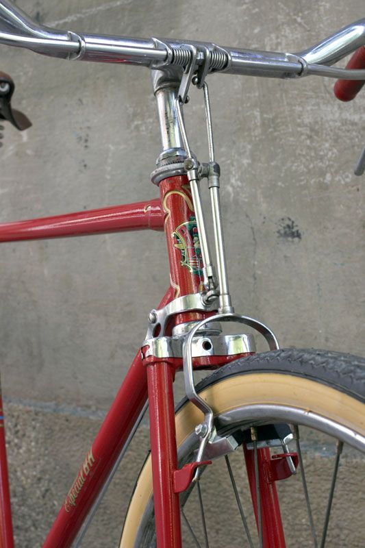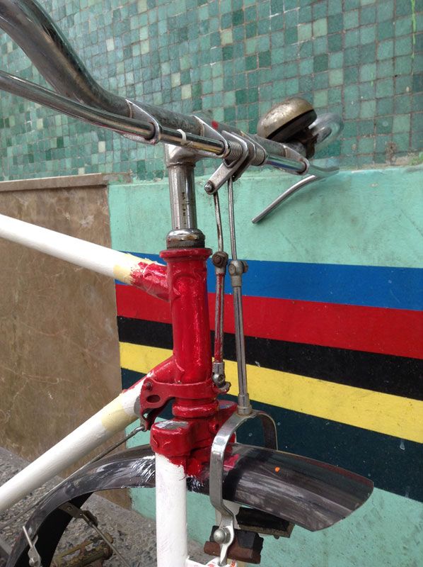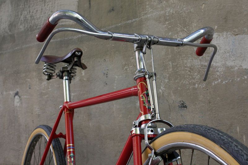 El color original de la bicicleta era el clásico rojo de esa época, pero Mercedes quiso pintarla en este elegante tono de rojo ferrari, para seguir un poco en la línea del anterior intento de pintarla. Las calcas, como no, se las encargamos a Jordi de Reciclone, que junto con el fileteado dorado de los racores, le dan un aspecto limpio y como recién salida de fábrica a la bicicleta.