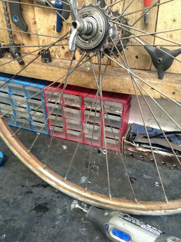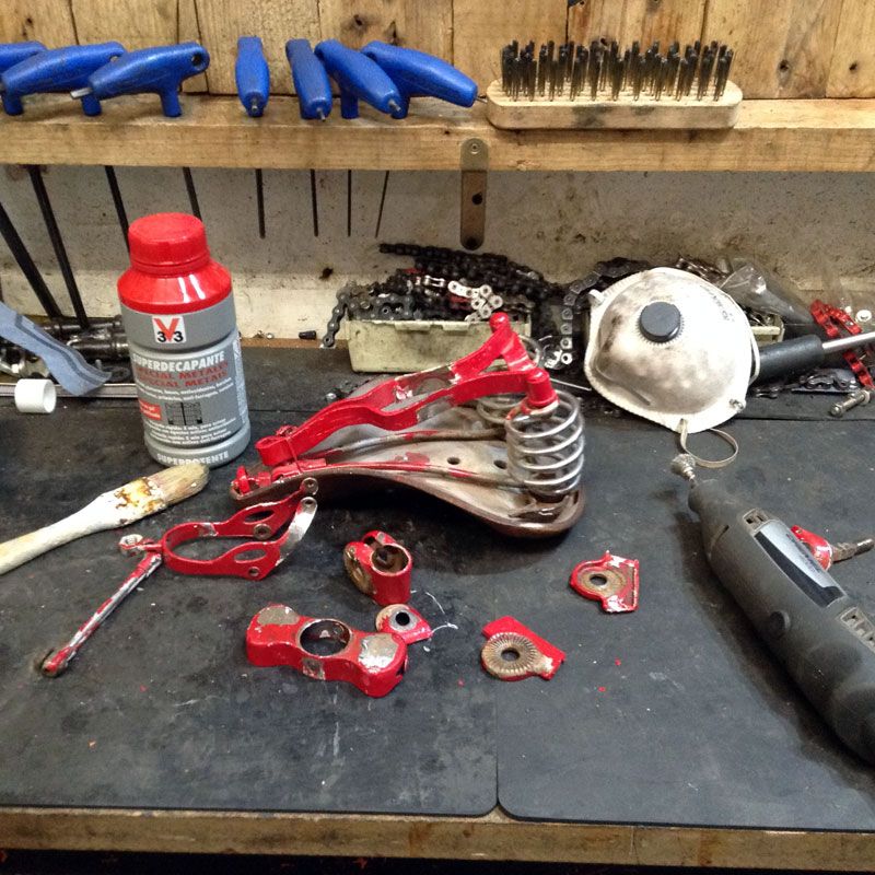 En estas condiciones nos llegó la bicicleta, con varias capas de pintura a brocha, los cromados repintados y con unos guardabarros de plástico que nada pegaban con la época de la bicicleta. Por suerte no presentaba mucho óxido, y por ello no hizo falta volver a cromar nada. Las ruedas vinieron a parte, pero por fortuna seguían siendo las originales y no tenían un estado de conservación muy malo. El óxido superficial no había pentrado hasta el núcleo del acero, por lo que un poco de dremel y lanilla de acero las hicieron revivir. Por supuesto, también tuvieron que pasar por el centrador de ruedas donde fueron afinadas otra vez con mucho mimo.