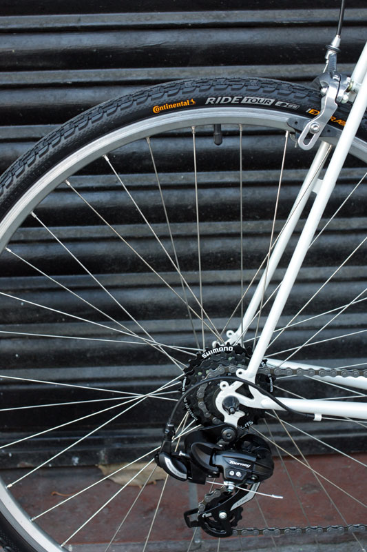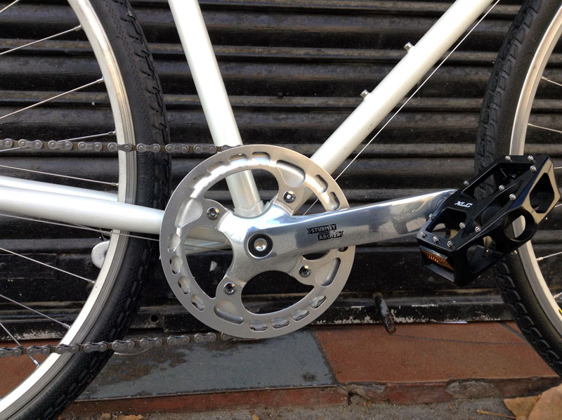 El resto del montaje de la bicicleta se hizo pensando en el uso urbano que le va a dar, de ahí su manillar de doble altura y una transmisión de 7 velocidades con monoplato. Las bielas de Sturmey Archer de un solo plato, con dientes para cadena de velocidades y cubre plato son una muy buena opción: elegantes, de calidad y ligeras.