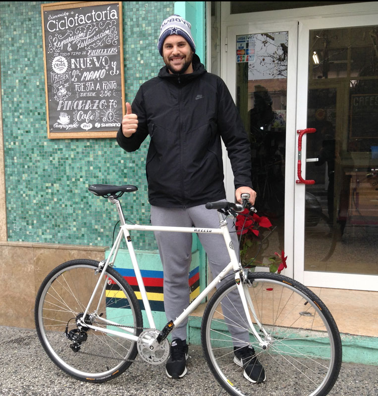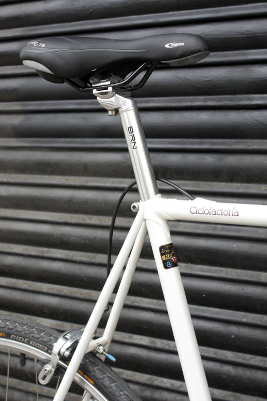 Álex es un tio enorme, en todos los sentidos, y hasta ahora usaba una BTT por la ciudad, más o menos adaptada a su tamaño gracias a haber subido la tija y alargado la potencia. Pero ni el cuadro era para su envergadura, ni sus componentes, sobre todo las ruedas, estaban preparados para su peso. Cada mes venía por el taller para que le pusiéramos unos cuantos radios que se le habían roto y le centráramos las ruedas. Harto de pasar más por Ciclofactoría que por su casa, nos pidió que le presupuestáramos una bicicleta para sus características, intentando que a la par de robusta, no fuera demasiado pesada, pues la sube a casa todos los días un par de veces. Es su bici de ciudad.
