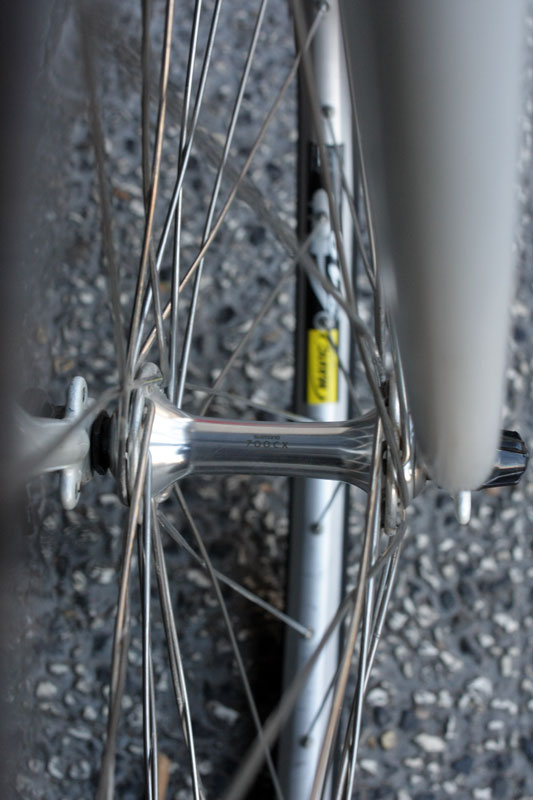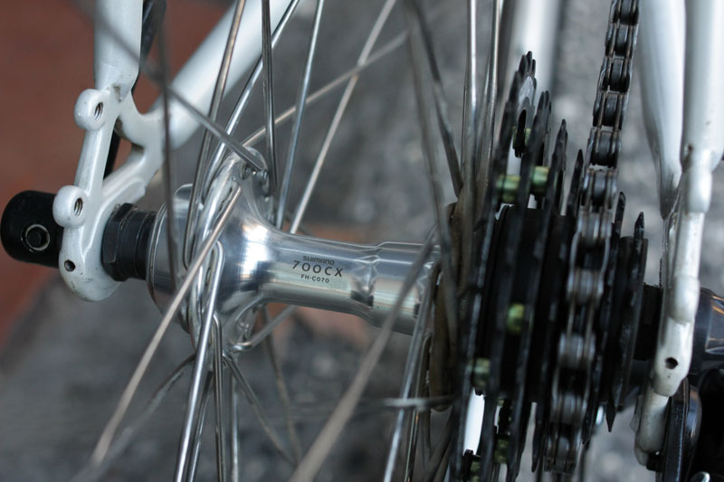 Pero sin duda, lo que más nos preocupaba eran sus ruedas. Lo que más nos interesa es que Álex no siga pasando por aquí dos veces al mes a poner radios nuevos, y por tanto, las ruedas tenían que ser bien fuertes. Una de las características clásicas del cuadro Razesa que elegimos es que la apertura de las vainas traseras es de 125mm, por lo que los bujes modernos de 135mm se quedan demasiado anchos. Por eso, elegimos unos bujes clásicos Shimano CX700 que teníamos en la vitrina de productos clásicos y unos radios DT Swiss Alpine III conificados, para radiarlos a 4 cruces. Cuantas más cruces elijas en el radiado de las ruedas, más largos serán los radios y más pesarán las ruedas, pero éstas serán exponencialmente más robustas, pudiendo aguantar todos los kilos que le puedas echar, entre el peso corporal y el peso extra en alforjas o mochila que lleves. Además, el grupo CX 700 de Shimano, el de los bujes que le montamos, son específicos para ciclocross y su eje, conos y rodamientos también están a prueba de sobre esfuerzos. Solo el tiempo y el uso demostrarán si hemos conseguido el resultado deseado, pero estamos convencidos de que si volvemos a ver a Álex entrando por la puerta del taller, no será seguramente por este tema.