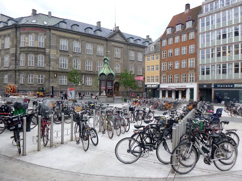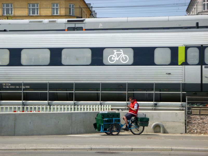 En estas tierras es habitual que la gente no viva en el centro de la ciudad sino en la periferia. Lo que aqui llamaríamos pueblos dormitorios o «el campo». Muchos de ellos estan conectados por trenes con la capital así que es frecuente que la gente tenga dos bicicletas urbanas. Una para ir de la puerta de su casa en el pueblo hasta la estacion de tren más cercana. y otra que le espera en el aparcabicis correspondiente de la estacion de tren del centro de la ciudad más cercana a su puesto de trabajo (Copenhagen ciudad tiene Metro 4 estaciones de tren que atraviesan la ciudad de norte a sur). Así, a pesar de que todos los trenes tiene su espacio habilitado para bicicletas con vagones específicos, no se ven dentro muchas bicicletas en los trayectos. La gente aparca su bici del pueblo en la estación, se sube al tren, baja y se pilla su segunda bici en la ciudad.