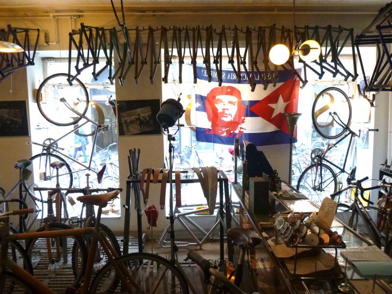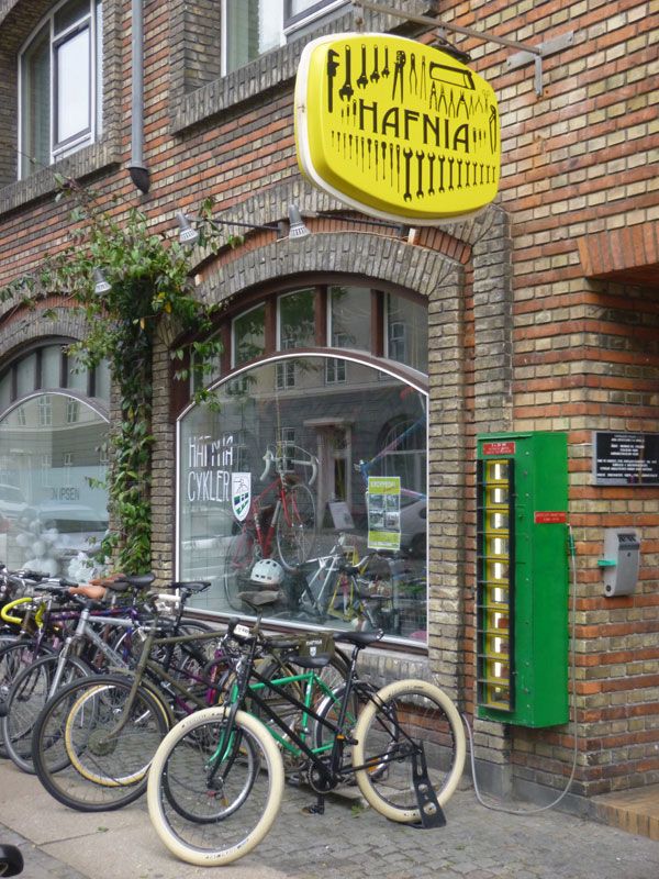 - Hafnia Cyckler: Al norte del barrio de Norrebro, se trata de la tienda más brutal de la ciudad! En 50 metros cuadrados encuentras todo lo que necesitas. Cuadros de acero de carretera y de pista, italianos, ingleses, daneses. Repuestos modernos y mucho material antiguo tanto usado como a estrenar. Suelen recibir bicicletas clasicas de carretera y convertirlas a 3 velocidades con una rueda de buje interno y freno contrapedal (que tanto les gusta). Tambien venden bicicletas de segundamano, chichoneras, maillots, y unos mecanicos más majos que para que. Hasta tienen un expendedor en la fachada del local con cámaras de repuesto, desmontables, aceite, condones y pitillos! Hafnia rules y si te pasas a conocerlo lo confirmaras.