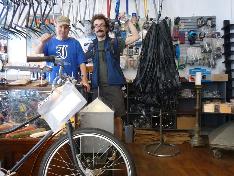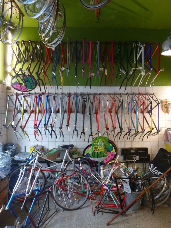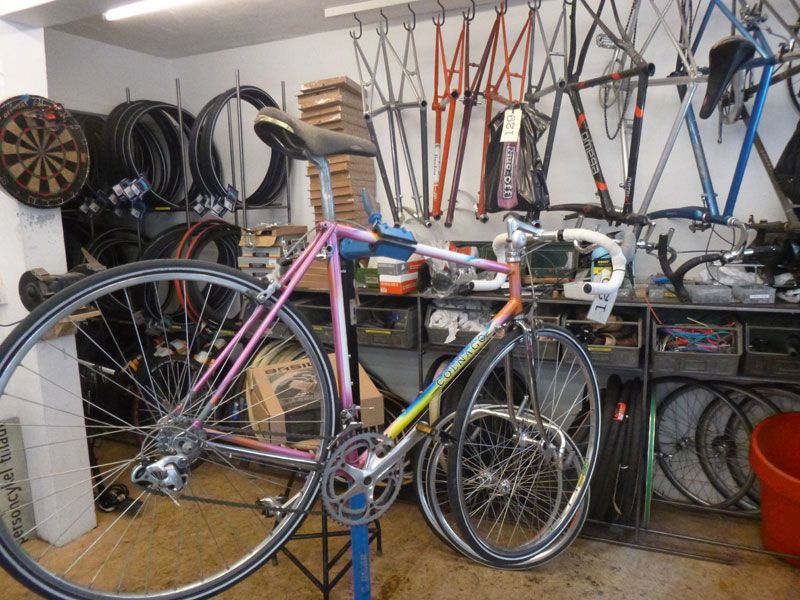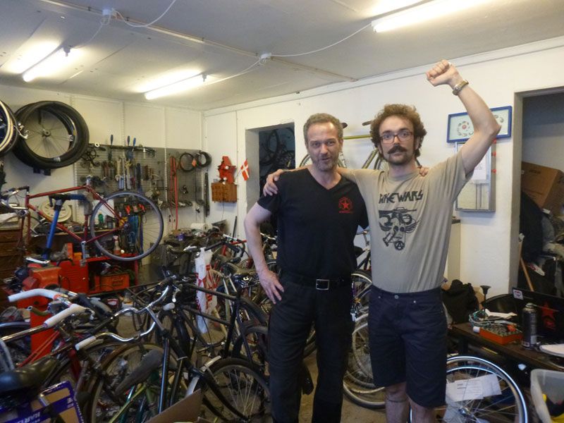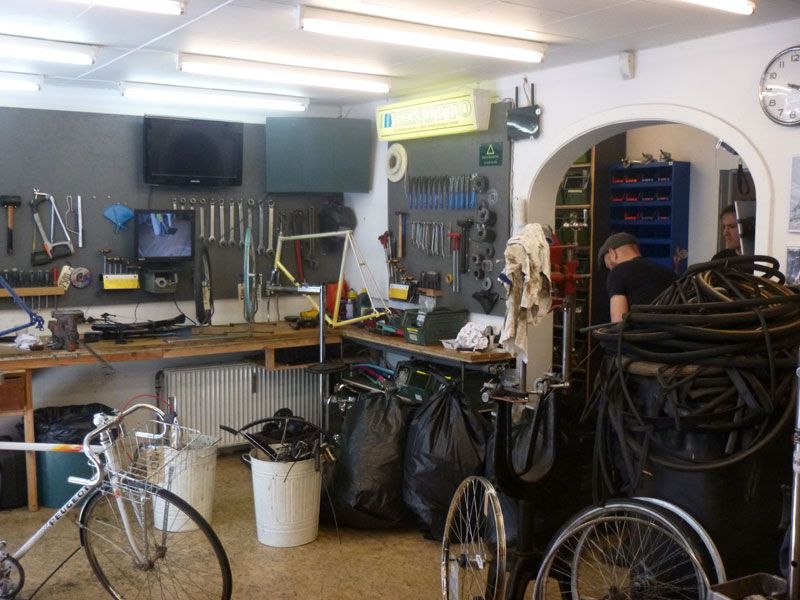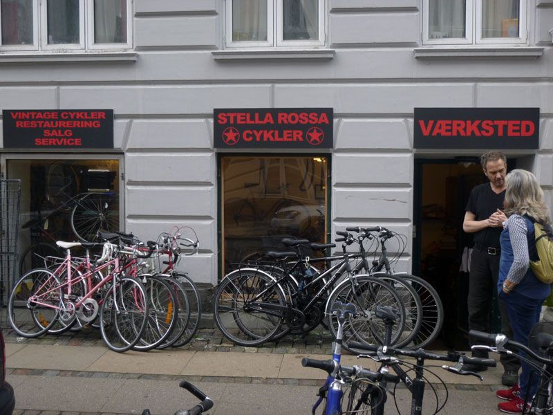 - Stella Rossa Cykler: El taller especializado en restauración de bicicletas clásicas de Estefano (increíblemente el único de toda la ciudad) desde luego que no va a salir en las guías turisticas. Escondido en una calle residencial del barrio de Vestrebro (muy cerca de «Recycles») cuenta con una amplia seleccion de bicicletas antiguas, muchas de ellas destartaladas, y otras muy bien apañadas, todas ellas con componentes clásicos originales. Y es que este mecánico de Milán no cree que eliminar las piezas de una bicicleta para instalar cotras nuevas sea algo que a la bici le vaya a gustar, y de hecho a él tampoco. Si buscas maillots de lana antiguos made in Italy, guantes, recambios de Campagnolo o para bielas de chaveta, o simplemente una agradable conversacion con un amante revolucionario de la bicicleta este es tu sitio!