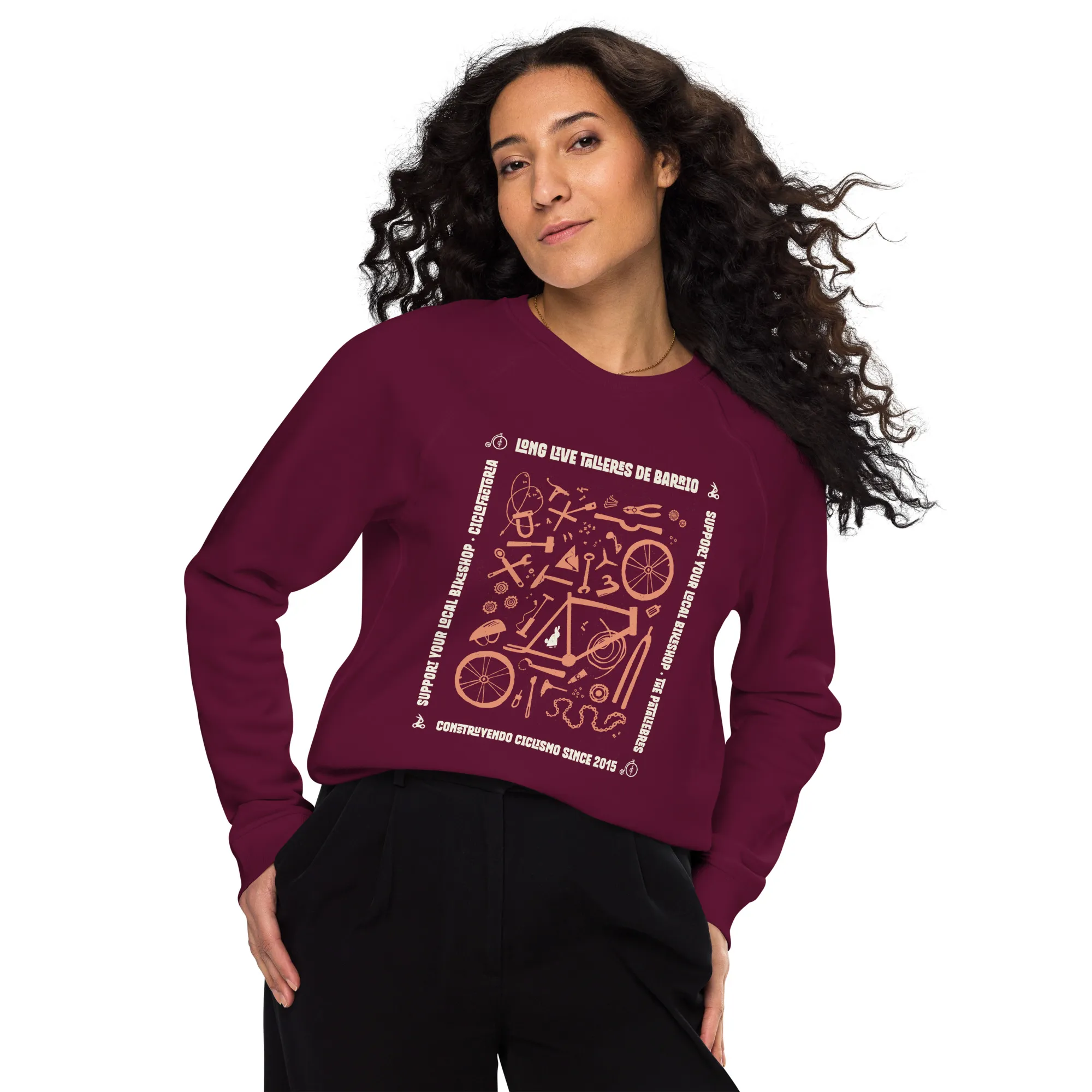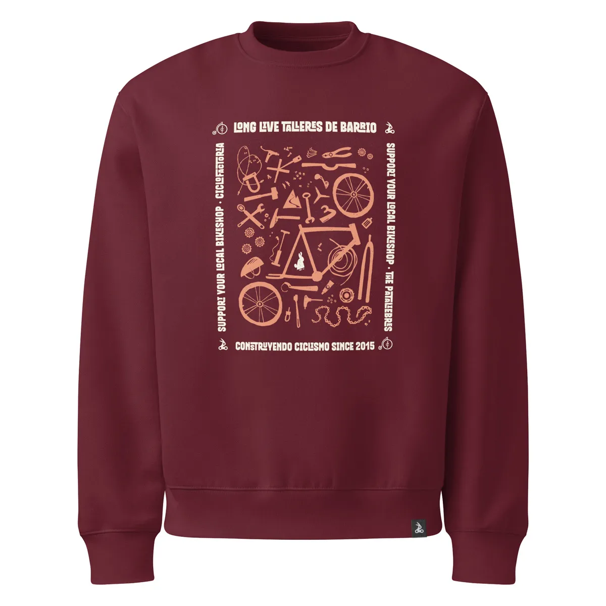 Edición limitada en colaboración con THE PATALIEBRES. de una sudadera UNISEX de cuello redondo, confeccionada en algodón orgánico premium en color burdeos. Suave, ligera y cómoda de verdad — de las que te pones para salir a rodar… y no te quitas en todo el día.