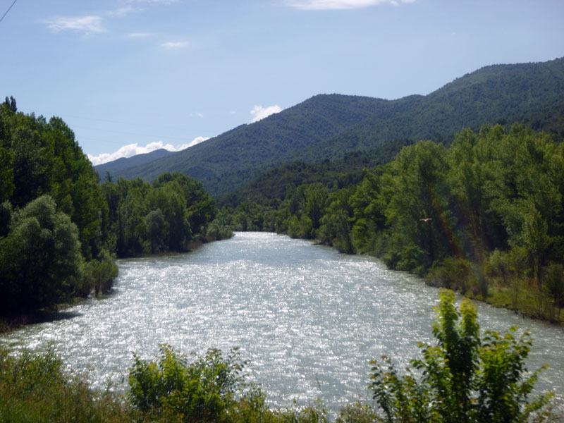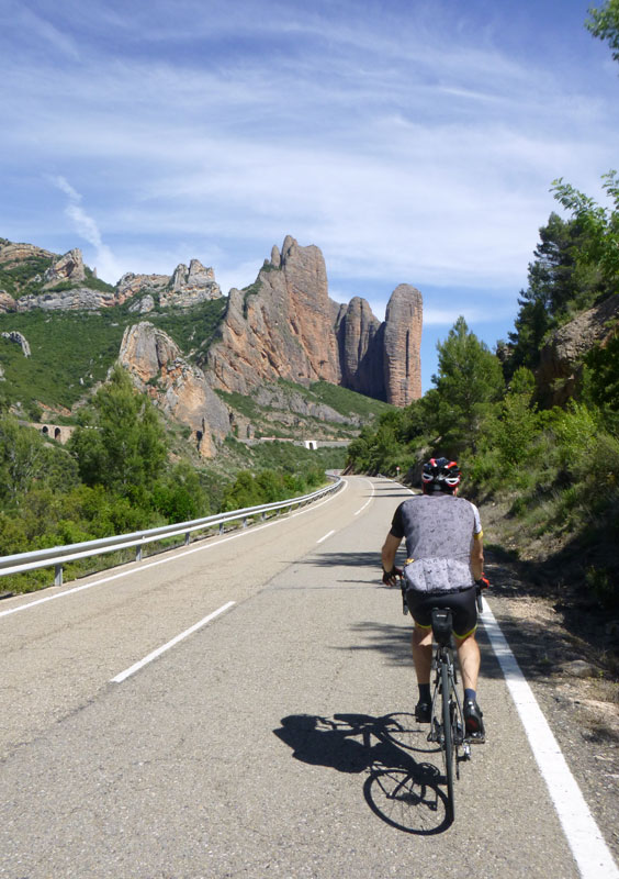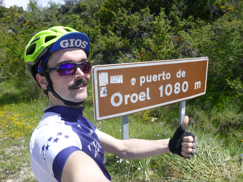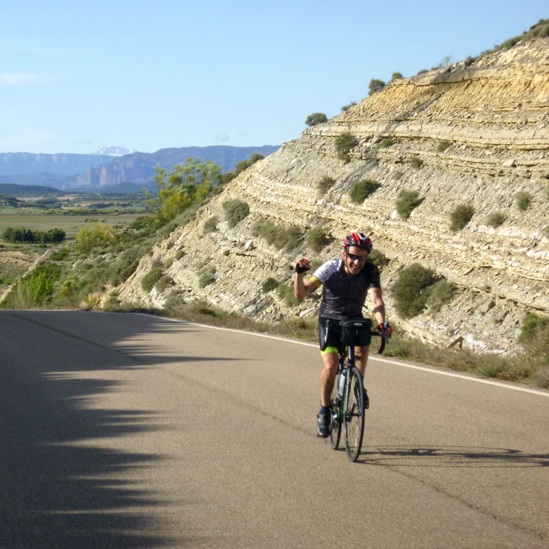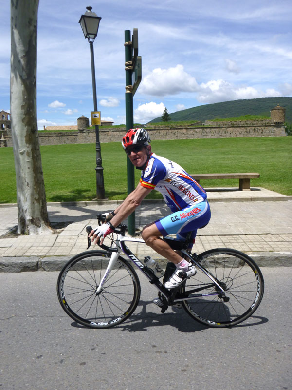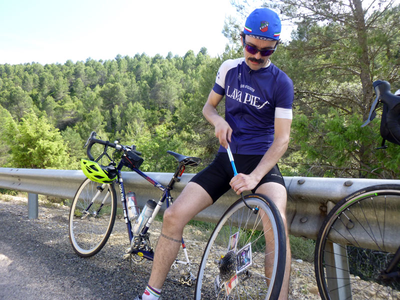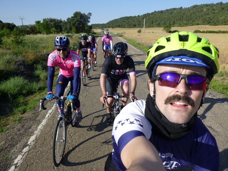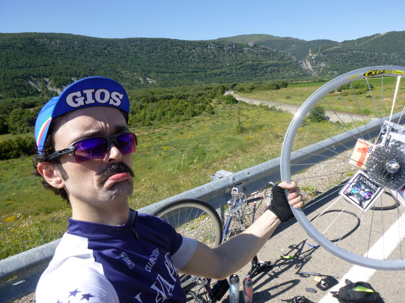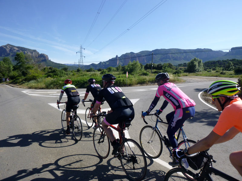 Así que nos subimos hasta Jaca pasando por Zuera, La Paul, Ayerbe, La peña, Anzánigo, Puerto de Oroel, encontrarnos con el compañero Dinamita que bajaba desde Canfranc para compartir un tramo de la ruta con nosotros (al final nos retrasamos y no pudo ser) y bajada a la capital jacetana. Tocar chufa, comer a tope y vuelta para la depresión del Ebro. Relevos, risas, comentarios, preguntas, avituallamientos, más risas, y para un servidor pinchazos, muchos pinchazos. «En casa del herrero cuchara de palo» y es que ha tenido que ser el mecánico del pelotón el que pinche hasta 5 veces, rompa el cambio trasero y el eje pedalier. Casi me meto en el coche de la organización ya desesperado por no volver a pinchar!