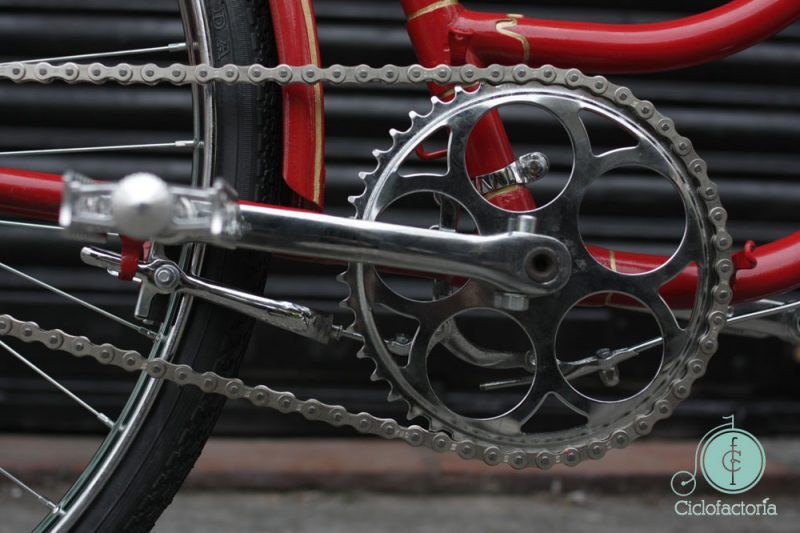 Para finalizar, se le montó un guardabarros delantero, que no traía la bicicleta, y lo único que faltó fue conseguir el cubre cadenas original, el cual seguimos en alerta para cuando lo encontremos, instalárselo. Para terminar de adornar la bicicleta, se añadió un cubre faldas al guardabarros trasero, como solían llevar antiguamente las bicis de paseo de mujer, para evitar que las faldas se metieran en la rueda.