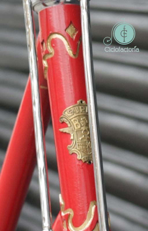 En cuanto a los adornos del cuadro, se decidió no repetir los fileteados. De todos modos no eran los originales y no estaban muy logrados, así que se decidió hacer algo más sencillo y a la vez estéticamente muy bonito, como es hacer unos fileteados alrededor de los racores del cuadro en dorado, a juego con la chapa BH Especial en el frontal de la pipa. Esta chapa estaba pintada de rojo, como el resto de la bici, pero tras un pulido a conciencia, salió a relucir el precioso color dorado original.
