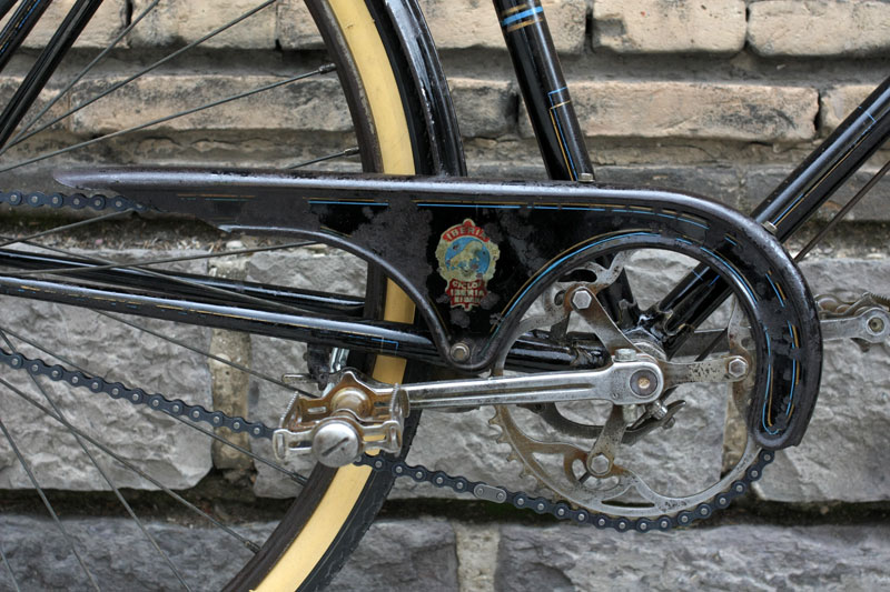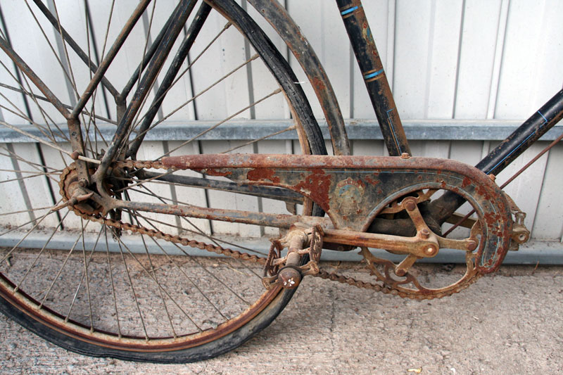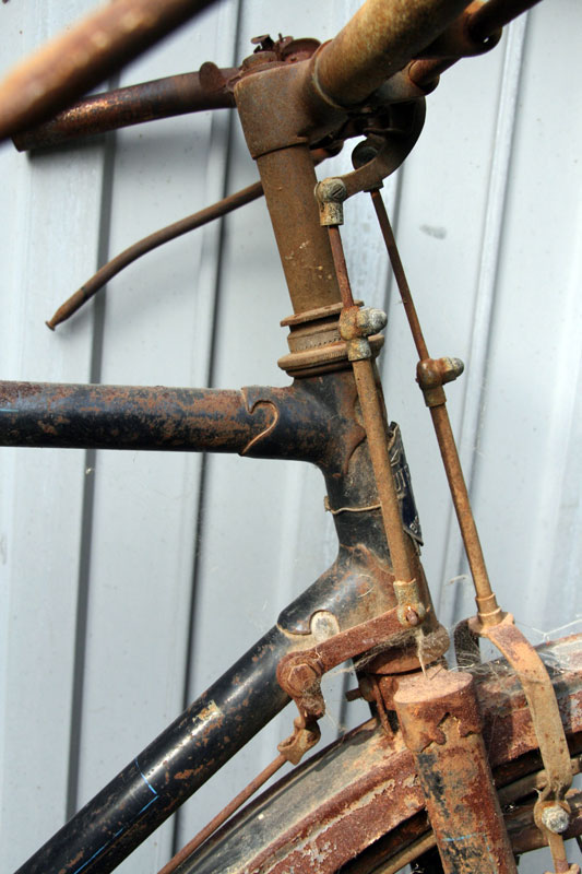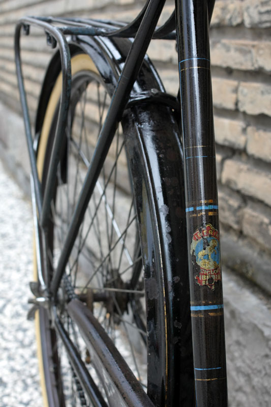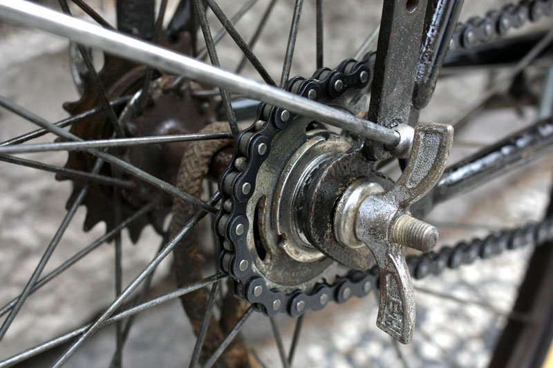 Las partes oxidades en la pintura de cuadro, horquilla, cubre cadenas y guardabarros las tratamos con un producto que convierte el óxido en una capa negra e impide que siga avanzando. Lo bueno es que la pintura o el barniz agarra encima de esta capa negra donde antes había óxido, ideal para el propósito de este trabajo. Como el color original de esta bicicleta era negro, estas partes oxidadas convertidas en capas negras no saltan a la vista, y le dan un aspecto mucho más limpio a la bicicleta. Después de tratarlas, le dimos pulimento a todo el esqueleto de la bici con la pulidora de mano y le sacamos el brillo que había estado cubierto bajo capas invisibles de polvo y suciedad. Para rematarlo, una mano de barniz y la bicicleta queda brillante y protegida para el resto de sus años.