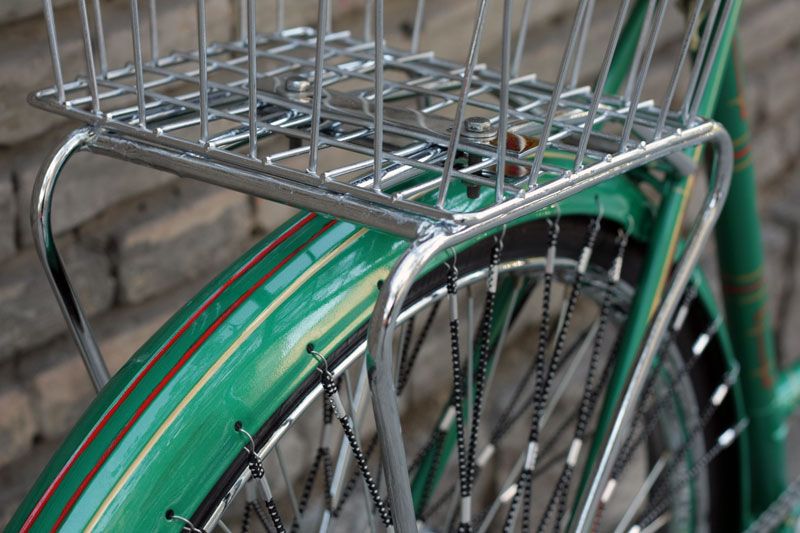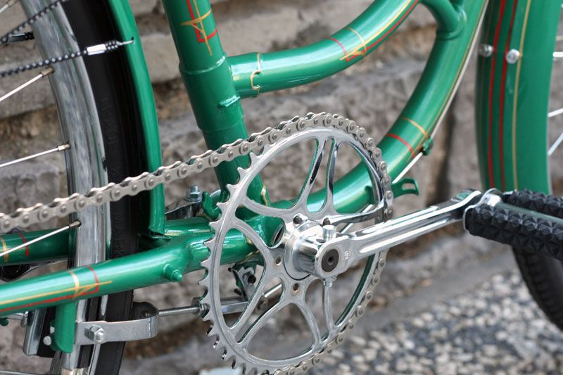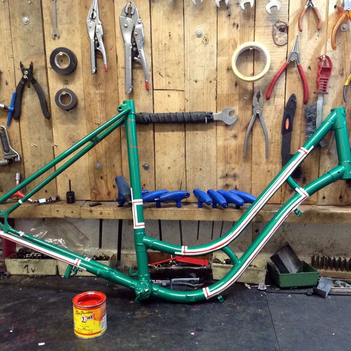Conseguir reproducir la pintura original de este tipo de bicicletas tan antiguas es un trabajo bastante complicado ya que antes se usaban esmaltes que en la actualidad ya no se fabrican. Con la gama y tipos de pinturas de hoy en día, hay que jugar con los metalizados, perlados y nacarados para acercarse lo más posible a los esmaltes y barnices de antaño. Escogimos un tono de verde metalizado sin mucho componente plata en su composición que se acerca mucho a cómo era el original de esta bicicleta antes de haber perdido todo su brillo y esencia con el paso de los años y las capas de suciedad que había acumulado.