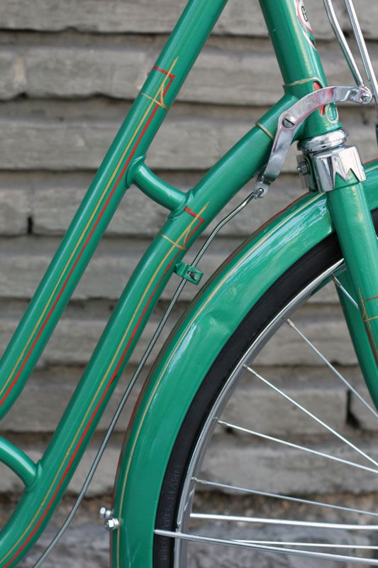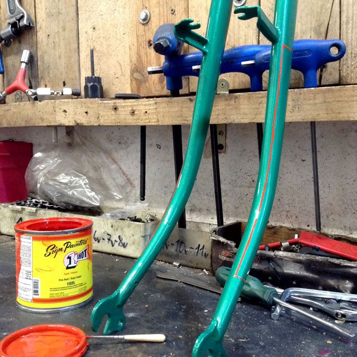 Los maestros del filetado, la mayoría de las veces maestras (hay que destacar), ese arte que perdió su popularidad cuando empezó la fabircación en masa de bicicletas, eran capaces de trazar las finas y suntuosas líneas a mano alzada, sin guías ni más ayuda que su pulso y su pincel. Nosotros, que todavía nos queda un largo camino por acercarnos a ellas, nos servimos de la ayuda de la cinta plástica para delimitar las zonas que queríamos filetear. La cinta plástica es más recomendable que la de carrocero, pues te permite trazar curvas redondeadas perfectas, con un poco de paciencia. La horquilla, que no tiene las curvas de este cuadro de paseo, sí que la fileteamos al estilo tradicional a mano alzada. A parte de recomendaros un par de artículos de nuestros amigos de Reciclone y Bicicletas Clásicas Leo sobre fileteados, os podemos dar un par de consejos si os queréis aventurar a restaurar vuestras clásicas monturas: