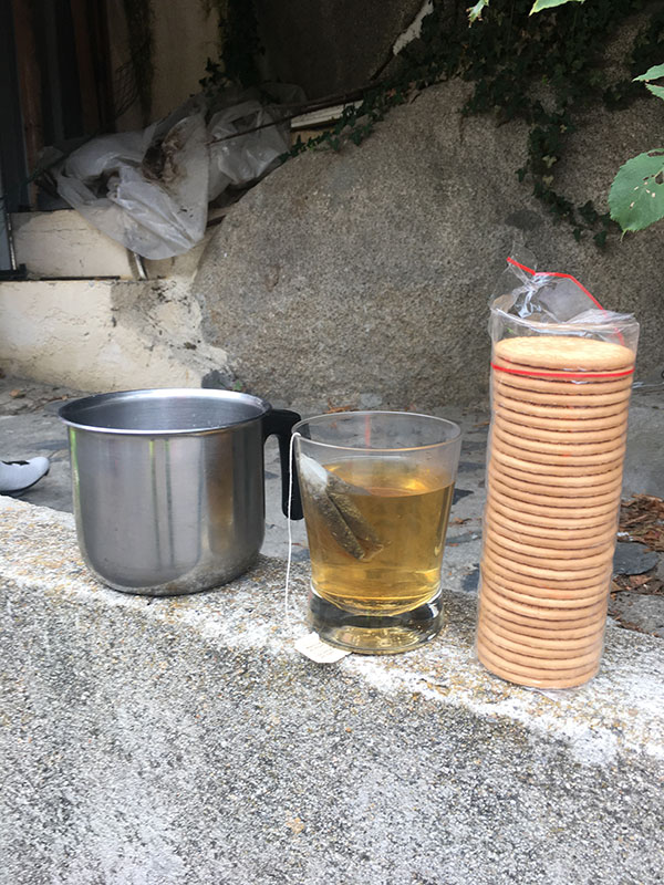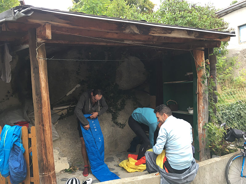 Bajamos juntos y Jose se queda dormido encima de la bici, ¡qué peligro! Lo mejor va a ser parar a dormir un rato, así que en el primer pueblo que vemos buscamos sitio. El porche de una casa nos sirve de refugio y los cuatro, como sardinas enlatadas, encontramos nuestro hueco para resetear el cuerpo y mente. 50 minutos son suficientes. 9.00h de la mañana y la familia de la casa, en cuyo porche hemos montado nuestro campamento improvisado, nos dan los buenos días. Son catalanes, súper majos y alucinan con nuestro rollo.