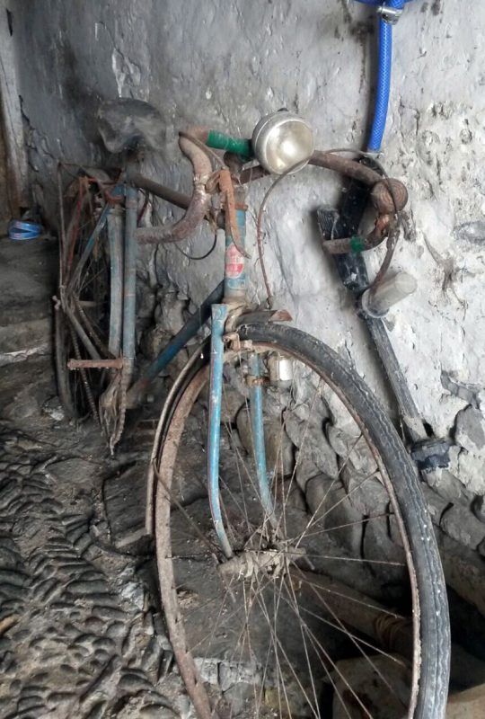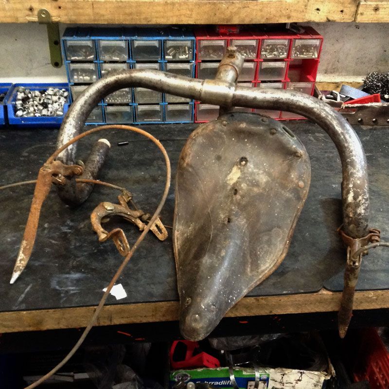 El estado inical de esta bicicleta era de «siniestro total», con las ruedas rotas y comidas por el óxido, el eje pedalier partido y un manillar clásico de carretera que le daba una postura incómoda para un uso urbano. La pintura original estaba escondida bajo unas cuantas capas de brochazos y la hacían de todo menos bonita.