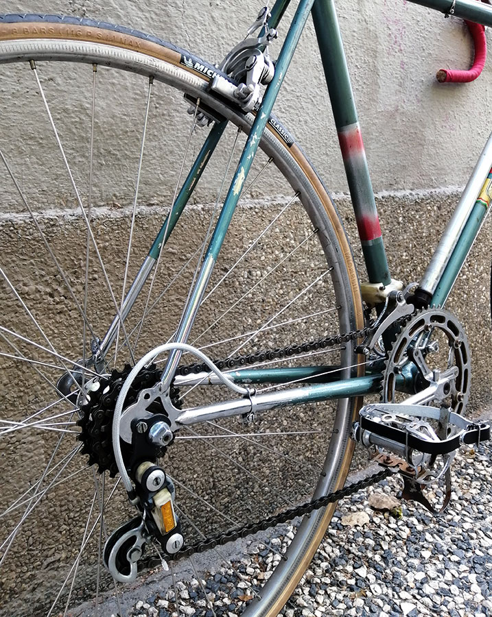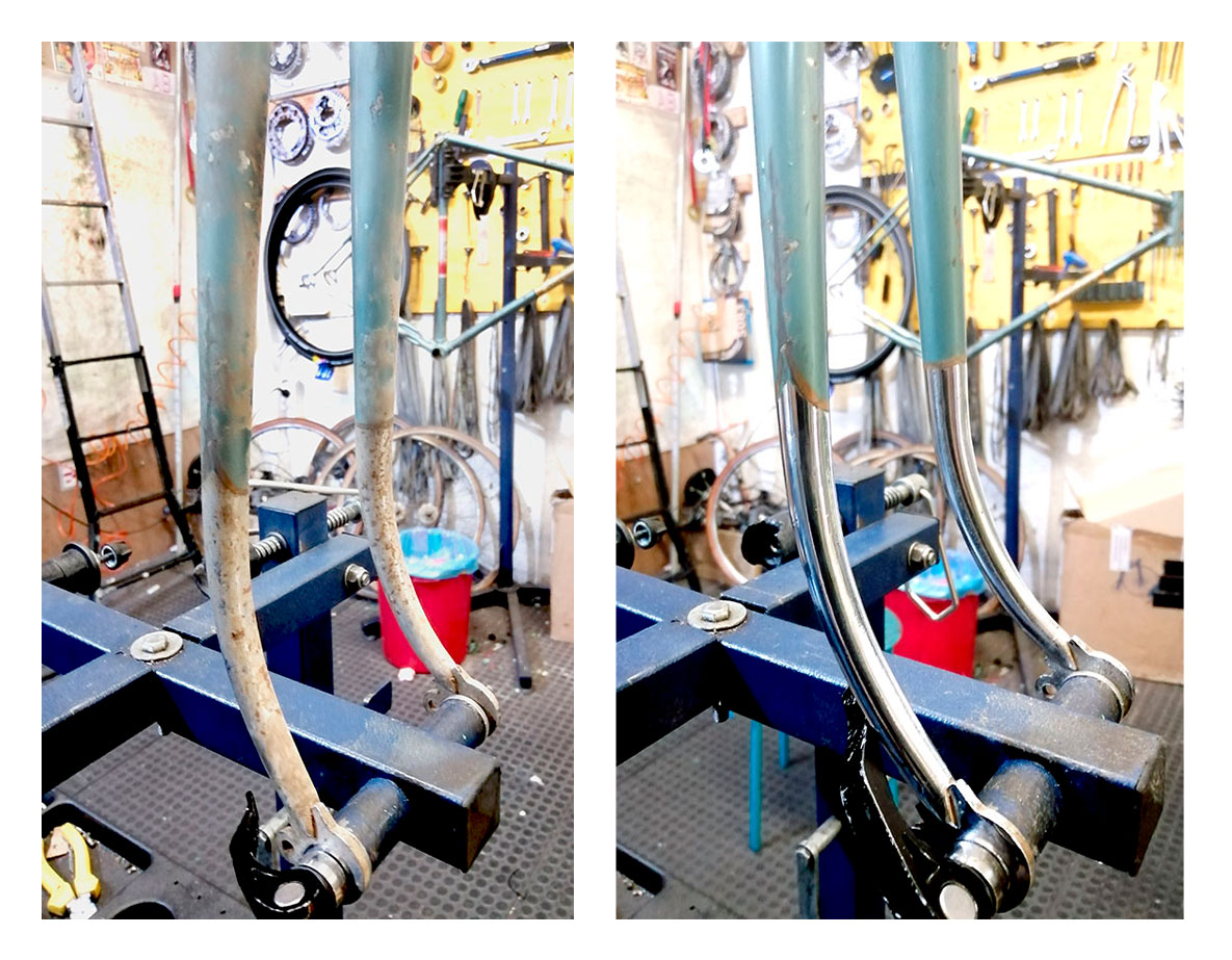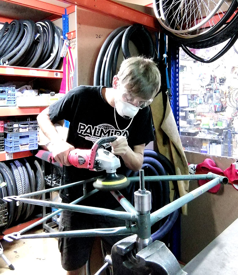 La idea de este trabajo fue hacerle justicia a esta elegante bicicleta puliendo todos sus componentes y barnizando cuadro y horquilla, sin el objetivo de disimular ni tapar las cicatrices y marcas de guerra de tantos años de uso, pero sí de dotarle nuevamente del brillo que se merecía.