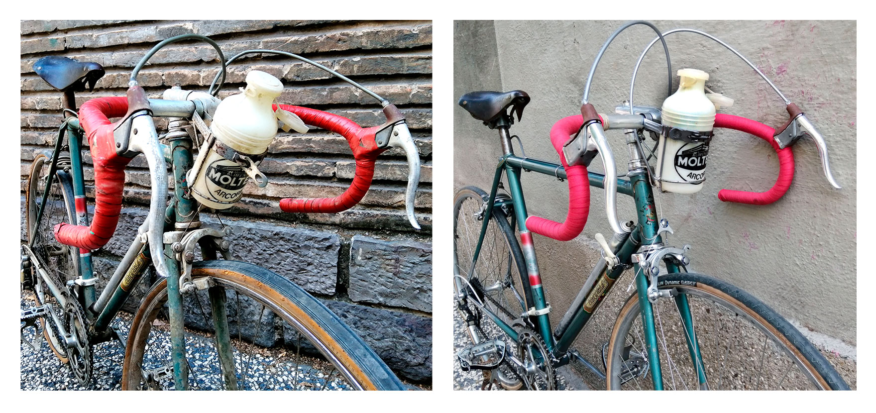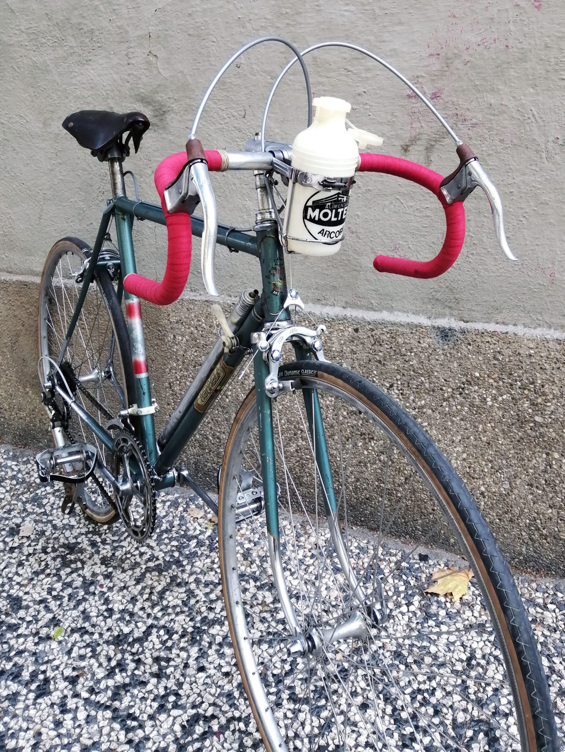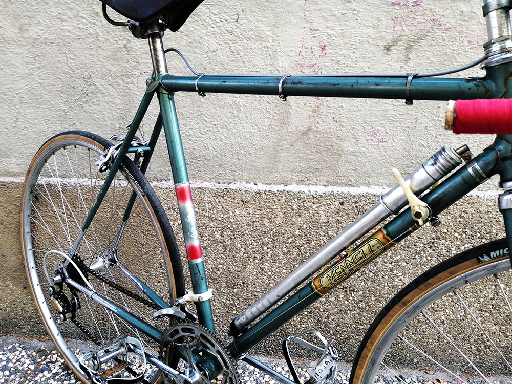 El montaje de esta Menneli se compone de frenos y manetas Mafac de tercera generación (años 60) y transmisión Simplex Prestige Senior (deviador) y Simplex Prestige Criterium (cambio trasero) de 1962. Las bielas son de la marca nacional Triplex. Como guinda del pastel, un precioso bidón del mítico equipo Molteni, uno de los más grandes de la historia y con el que Eddy Mercx haría historia en la década de los 70.