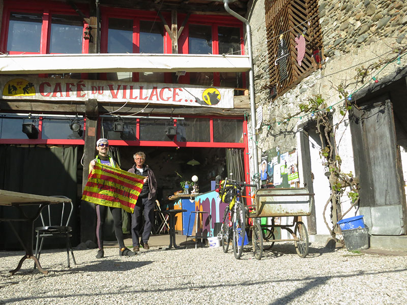 Al otro lado sombra y frio. Una bajada rápida desde los 1800 metros de altura hasta el pueblo de Saint Lary, y de ahi descender La Garona hasta el llano. La tarde comienza y no sabemos dónde dormir. Todo esta cerrado como es normal el 1 de Mayo. Algaradas en Paris y tranquilidad dans les Haute Pyrenees. El espíritu de Vicente Blanco me guía hasta un pueblecito diminuto, de los que no aparecen ni en los mapas. Le Cafe du Village de Aneres me da la bienvenida, me invita a una cerveza y me ofrece cobijo para la noche. Un proyecto autogestionado de 20 años de historia que organiza un festival de cine mudo hermanado con el de Uncastillo y que está siempre abierto a caminantes, ciclistas y en general todos los viajeros amantes del arte y la buena compañía. Didier, Marcos, Roger y otros tantos y tantas compañeras que participan en el proyecto me abren las puertas de su casa para cocinar, beber y descansar, como si hubiésemos sido amigos y familia en otra vida pasada.