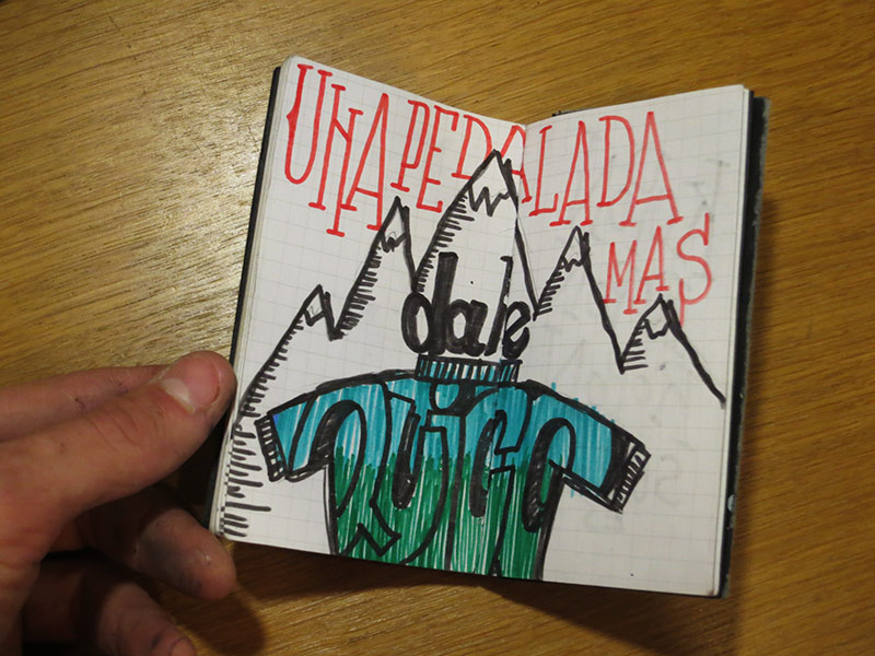 Una vez en casa solo puedo estar agradecido. Contento de haber pasado así mis vacaciones y agradecido a todas y todos los que han apoyado y ayudado. A Dani «CORDEL» por haberse currado tan rapido el material que ha sido imprescindible en la ruta. Mola mucho viajar con Bikepacking!; A Los Alicates y demás compas de la bici por esos ánimos tan valiosos; a Jose de «Talleres La Vieja» por haber hecho expres el prototipo de estabilizador para la bolsa de sillín, ha funcionado a la perfección; a Irra de «Ciclismo sin Prisa» por haberme dejado la cazuela que tan bien me vino para papear!; a Raul por haberme dejado la bandera de Aragón y este precioso diseño en el cuaderno de ruta; a victor por haberme cuidado tan bien, a Laura, Sheti, Richi, Laus y Lino por haberme recibido con los brazos abiertos; a Fran, Trini, Kote, David y demás gentes que me albergaron en sus casas, a mi padre y mi madre por haberme financiado papeo y trenes; a mi hermana Marta por solucionarme papeleos; y sobretodo a Borja y a Jose, mis compañeros del taller por haberse hecho cargo del tajo en temporada alta. Sois unos cracks!
